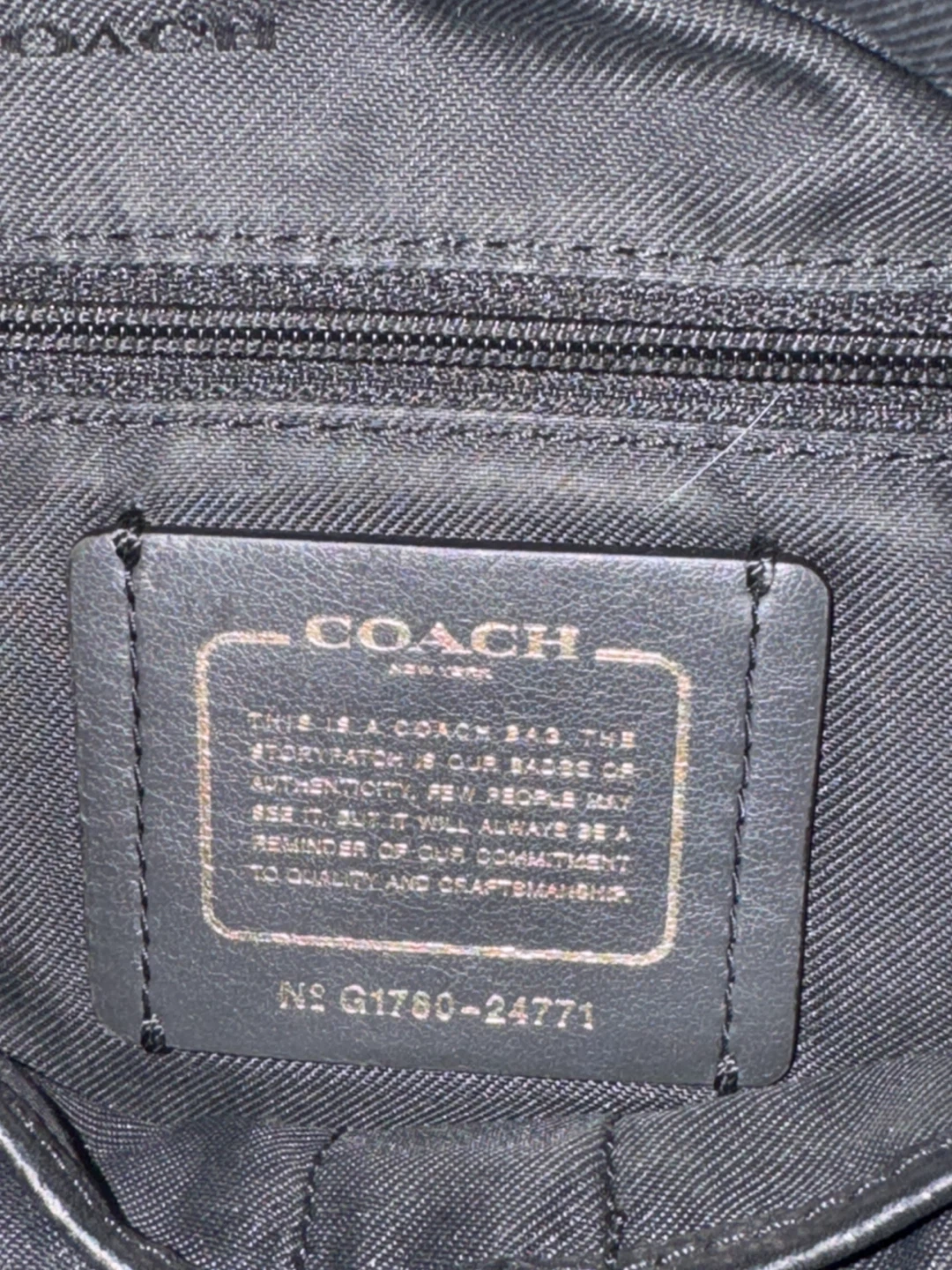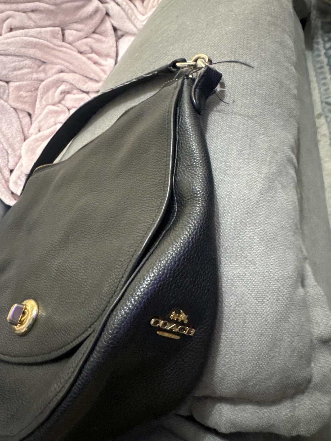 This is a Coach shoulder bag made from black pebbled leather. It features a turn-lock closure and a removable strap for versatile wear. Interior zip pocket.