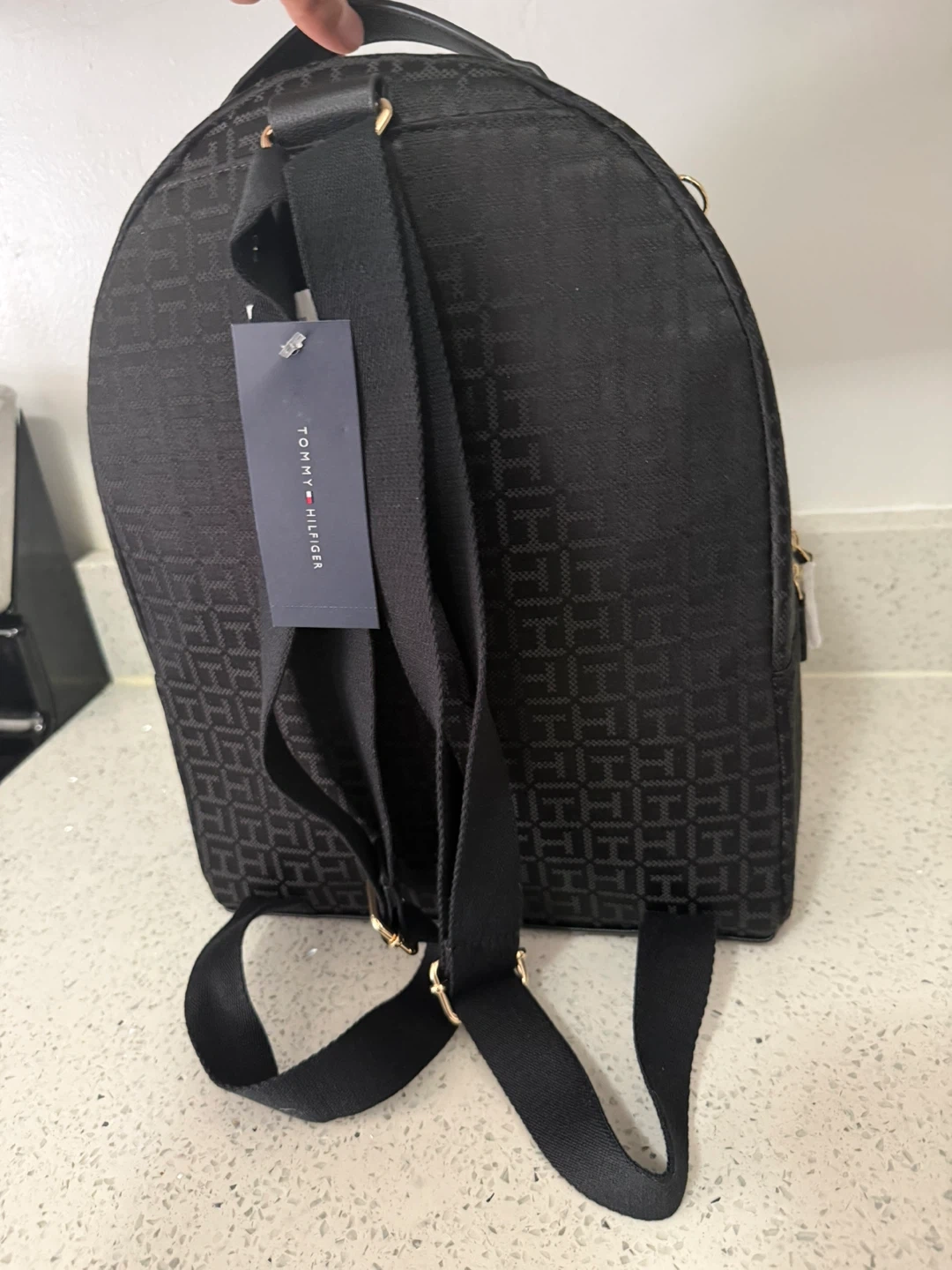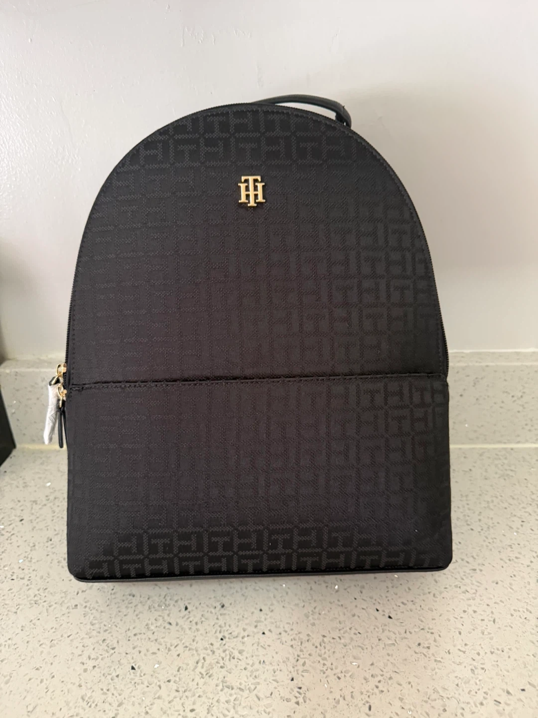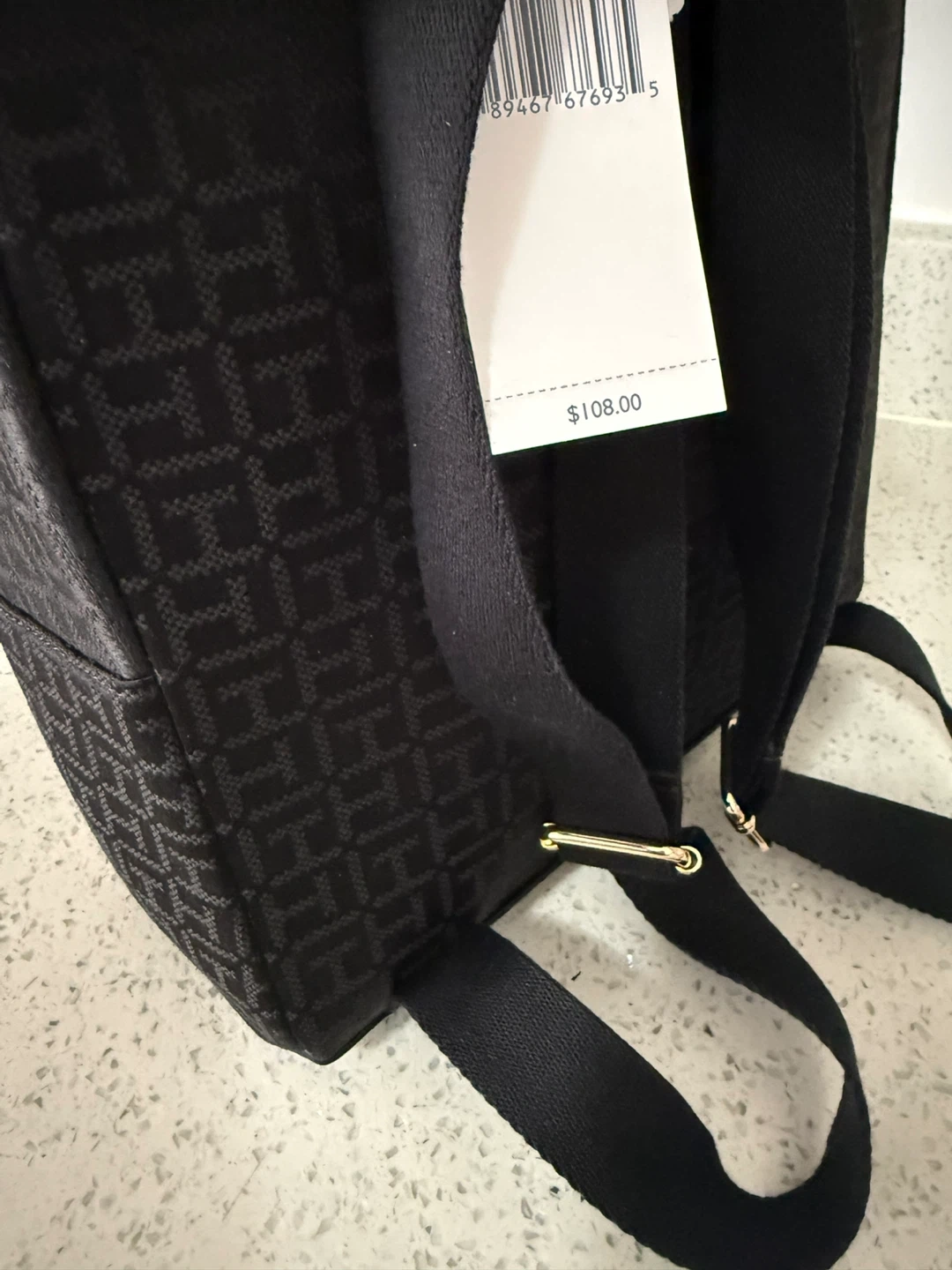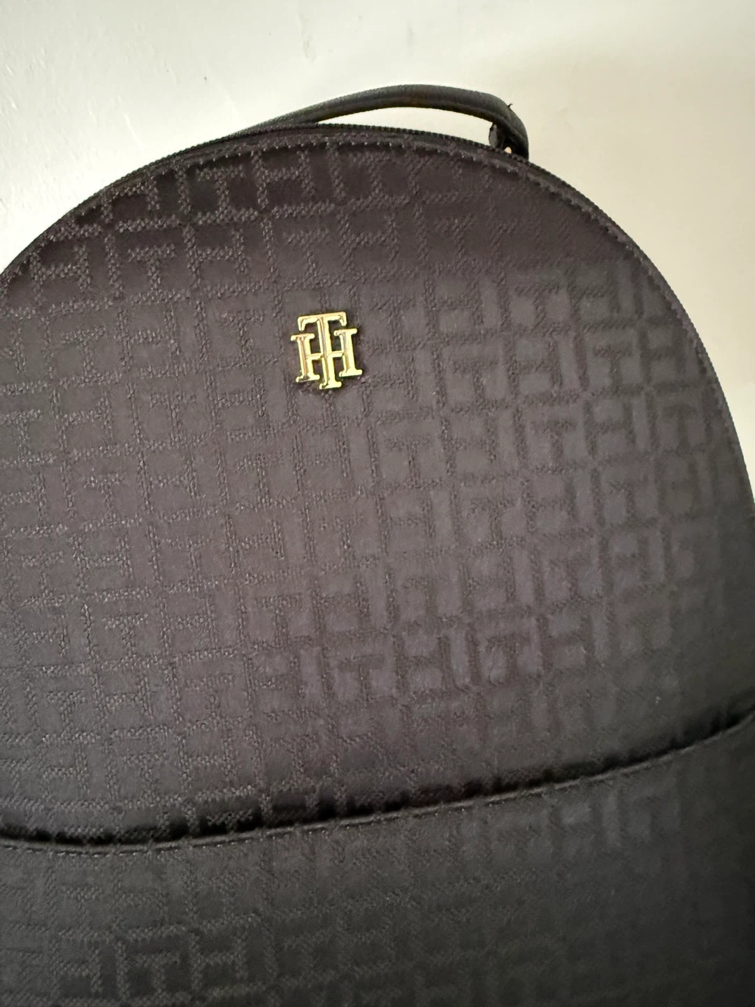 This black Tommy Hilfiger backpack features the brand's signature monogram pattern. It's made from durable material and has adjustable straps. Includes original tags.