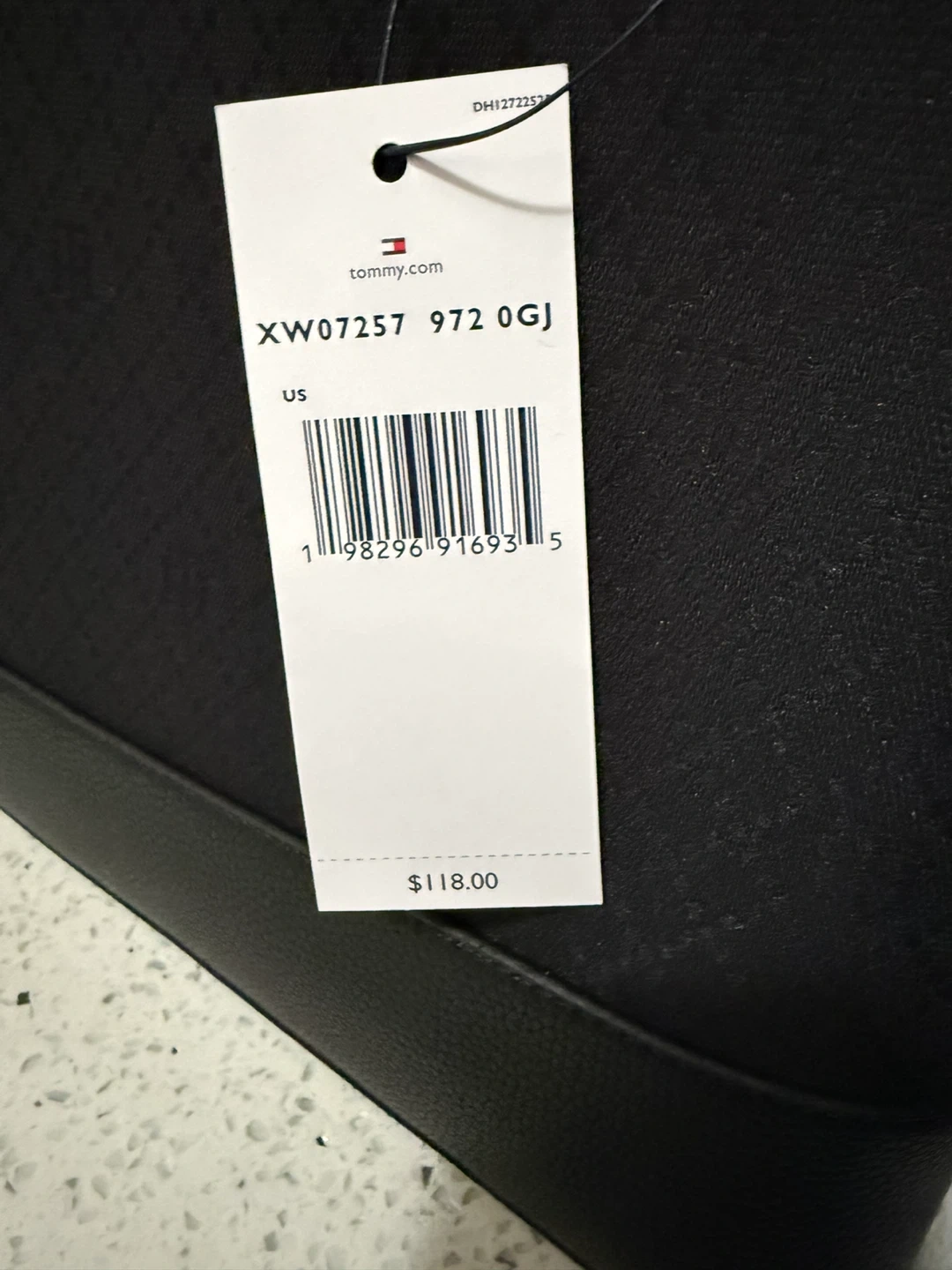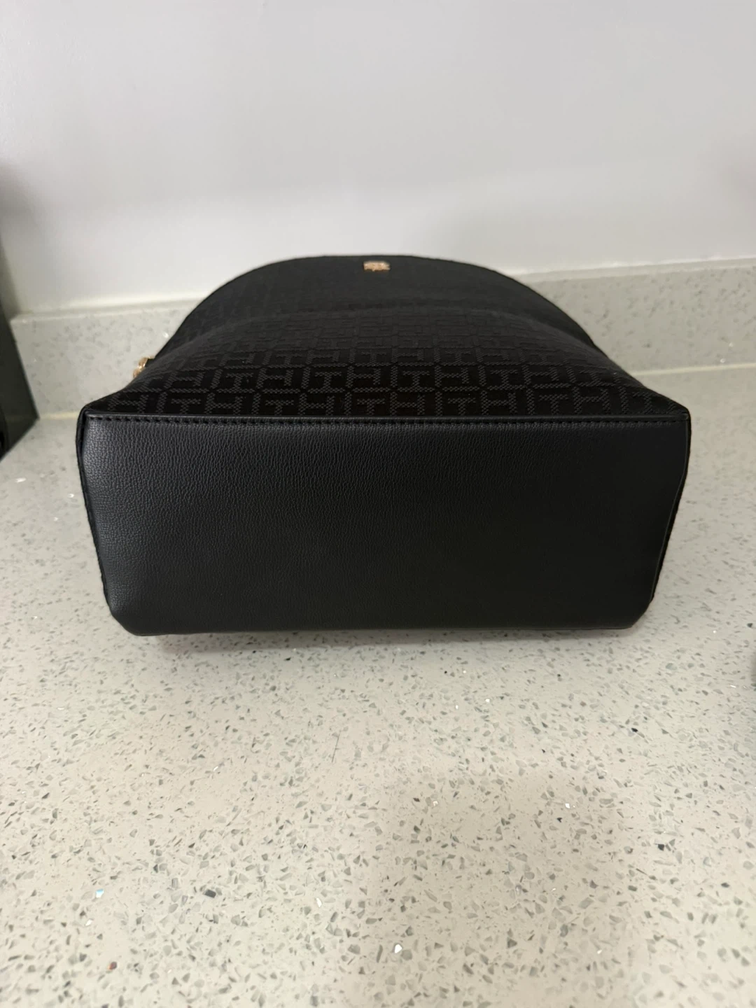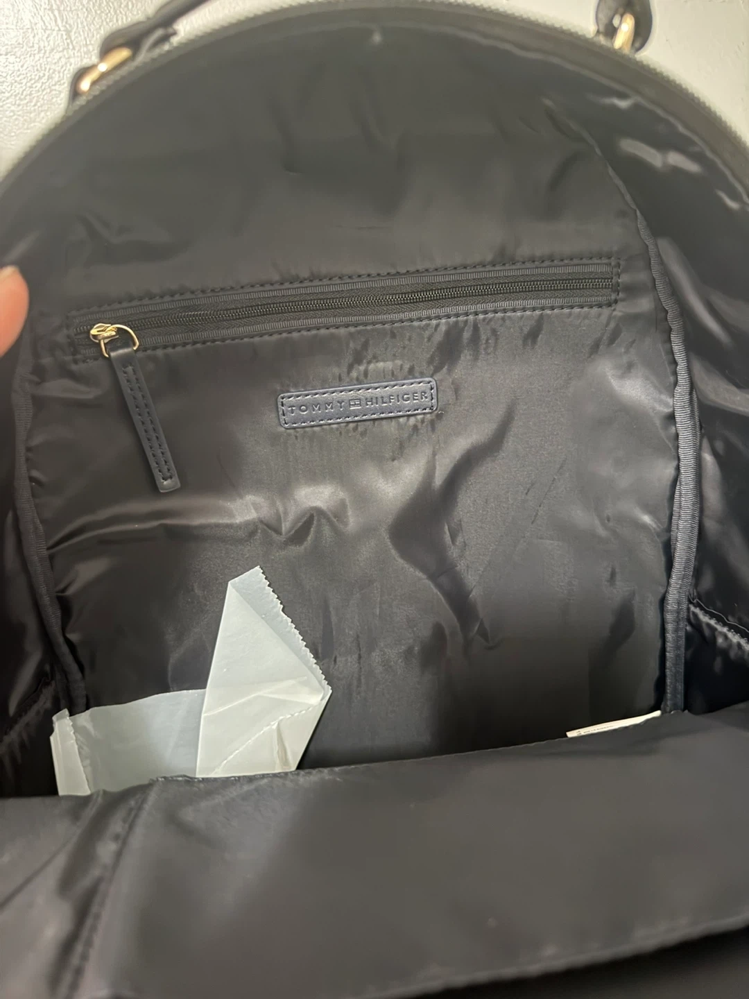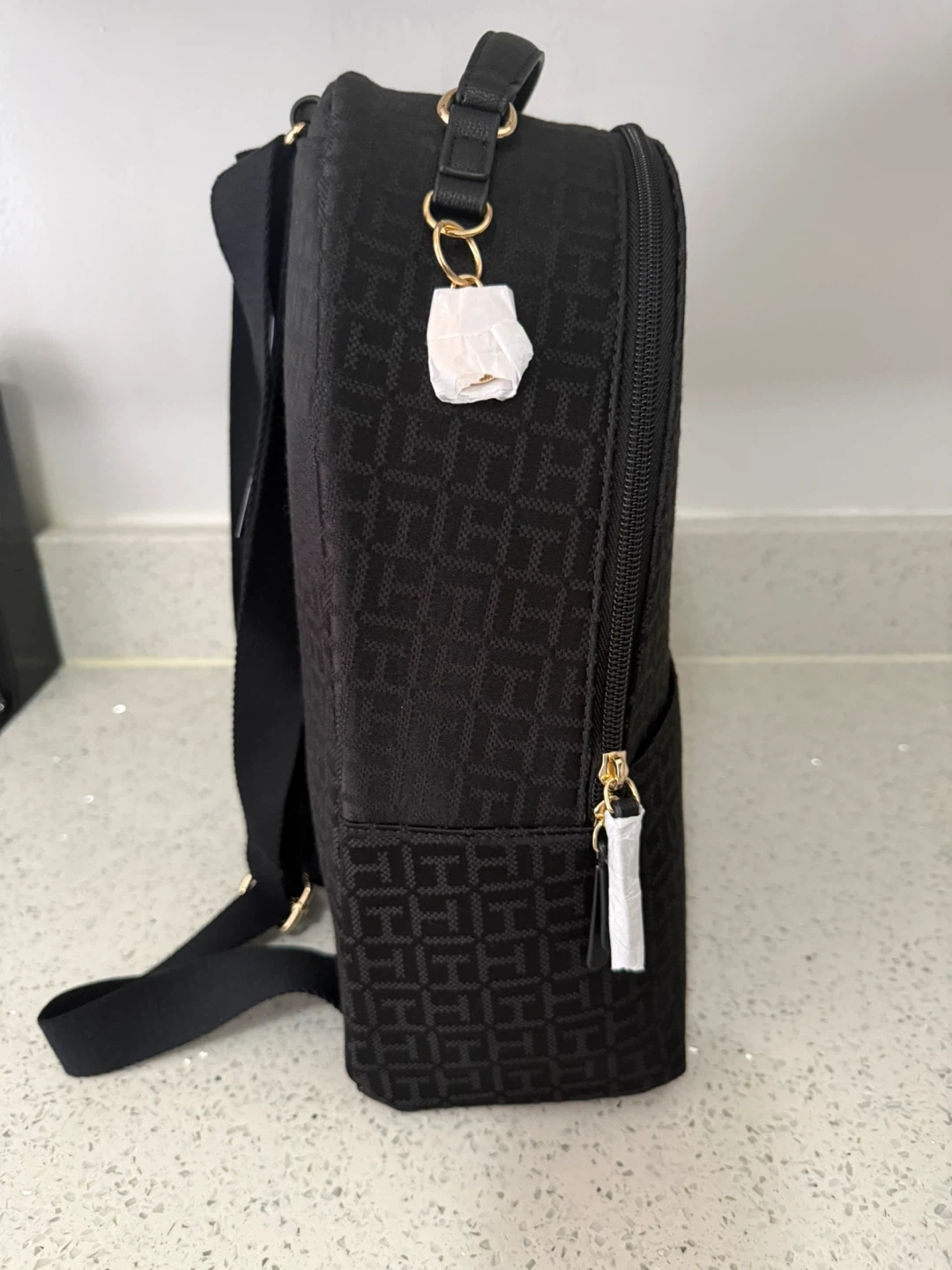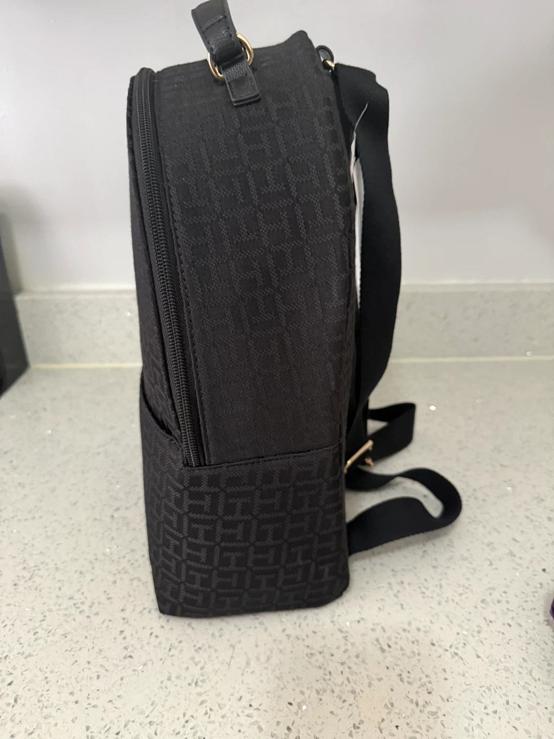 This black Tommy Hilfiger backpack features the brand's signature monogram pattern. It's made from durable material and has adjustable straps. Includes original tags.