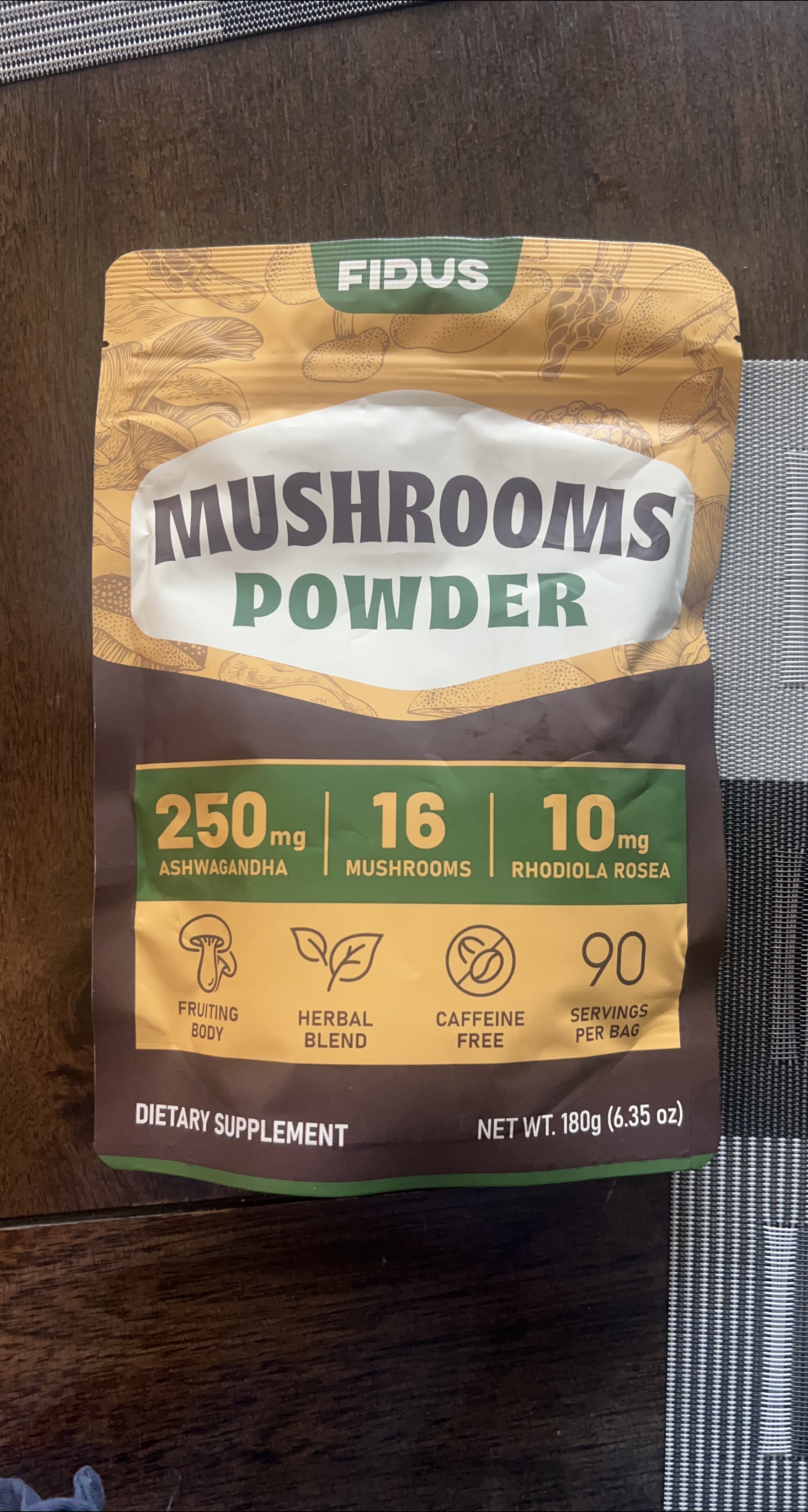 Selling a bag of Fidus Mushrooms Powder dietary supplement! It contains 250mg of Ashwagandha, 16 mushrooms, and 10mg of Rhodiola Rosea. Each bag contains 90 servings and is caffeine free. Net weight is 180g (6.35 oz).
