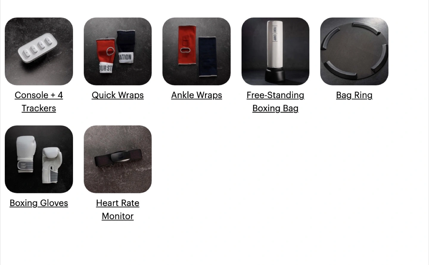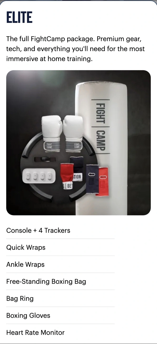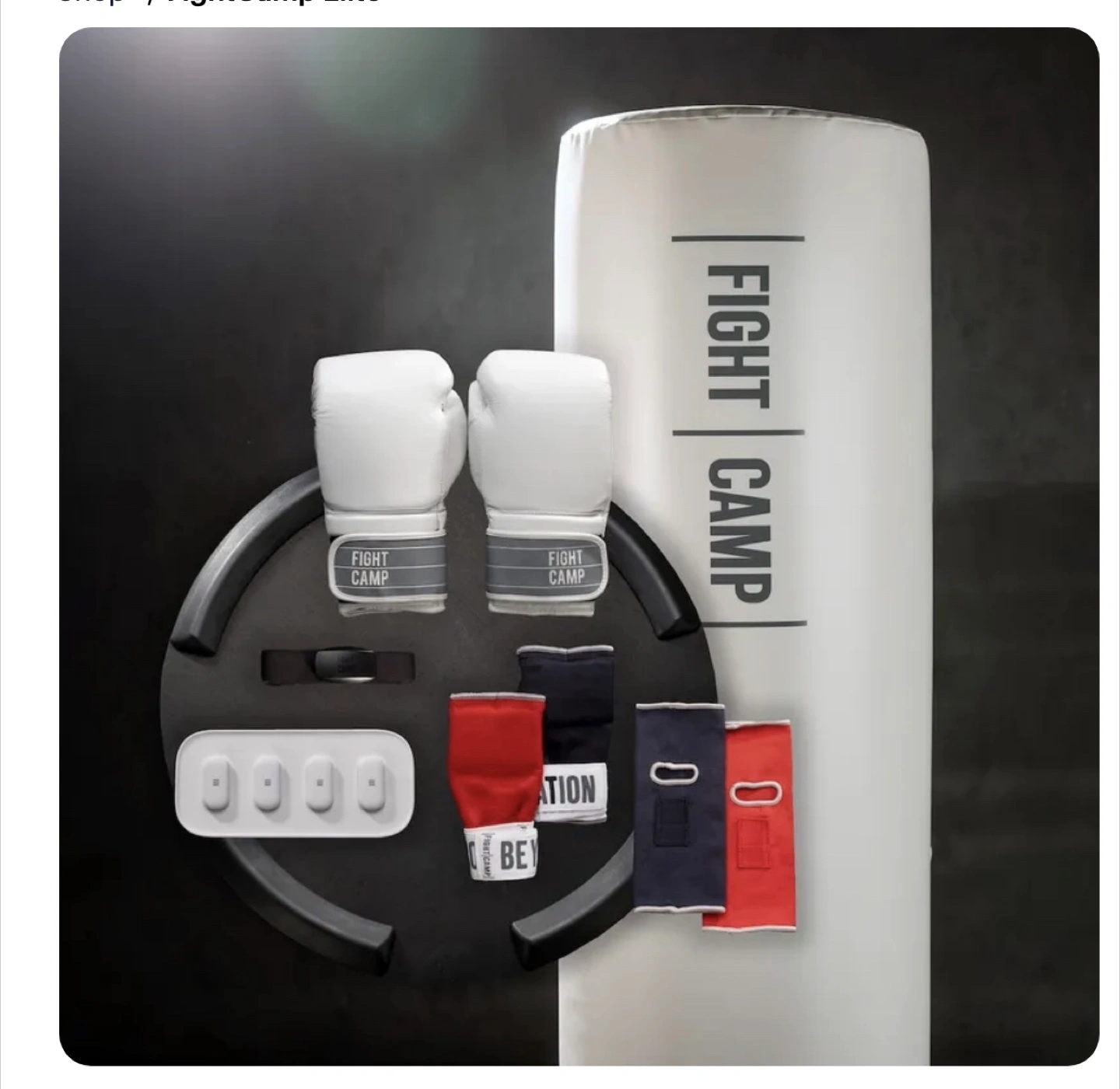 Selling a full FightCamp Elite package! This includes everything you need for an immersive at-home training experience. The package comes with premium gear and tech, including a free-standing boxing bag, boxing gloves, console + 4 trackers, quick wraps, ankle wraps, bag ring, and a heart rate monitor. It’s new