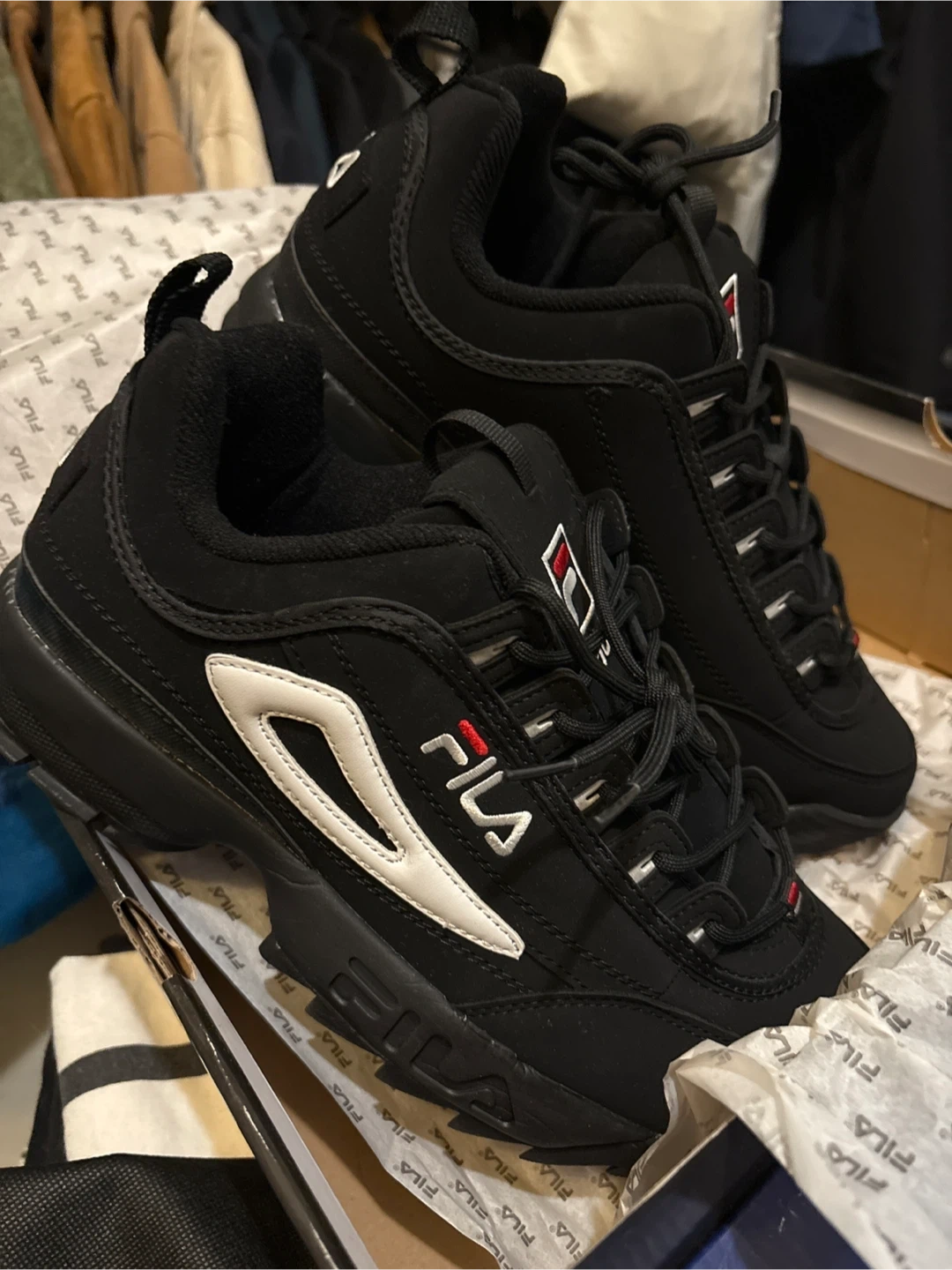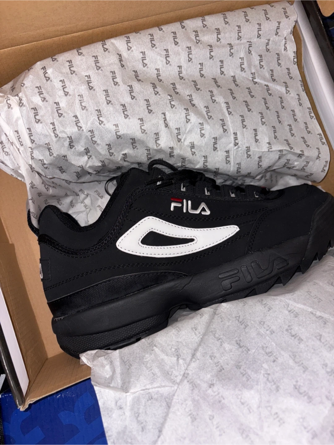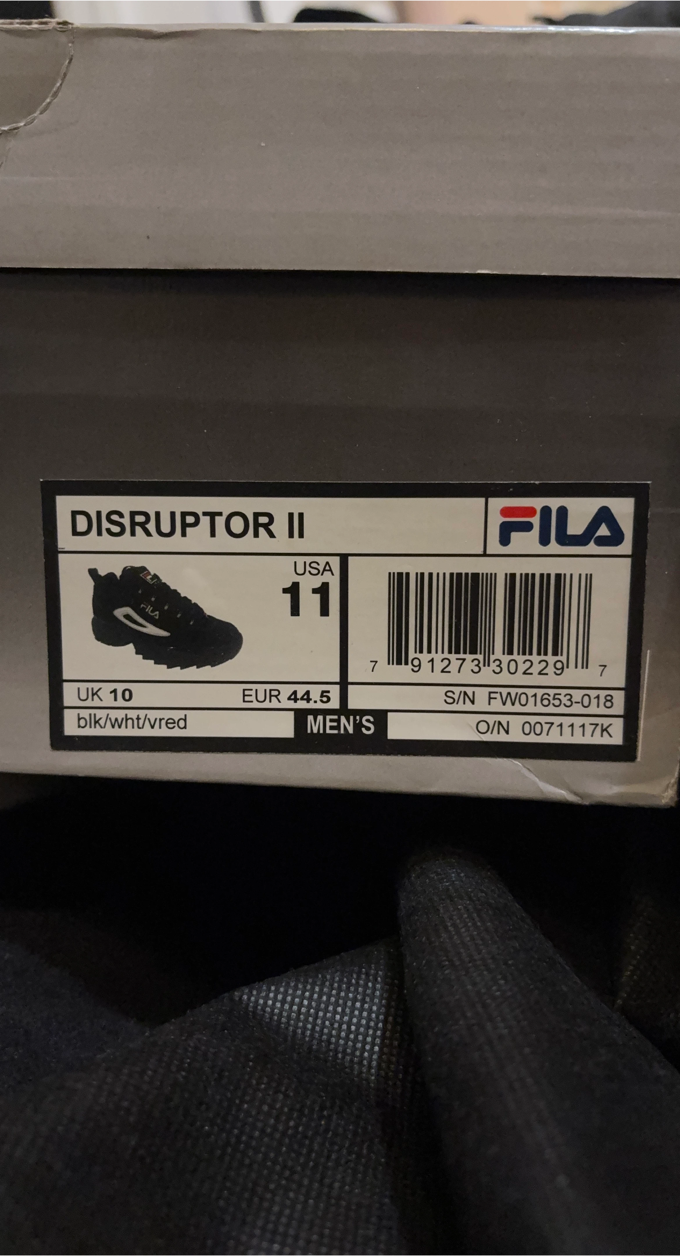 65Selling a pair of Fila Disruptor II sneakers in black, white, and red! They are in men's size US 11. The box is included.