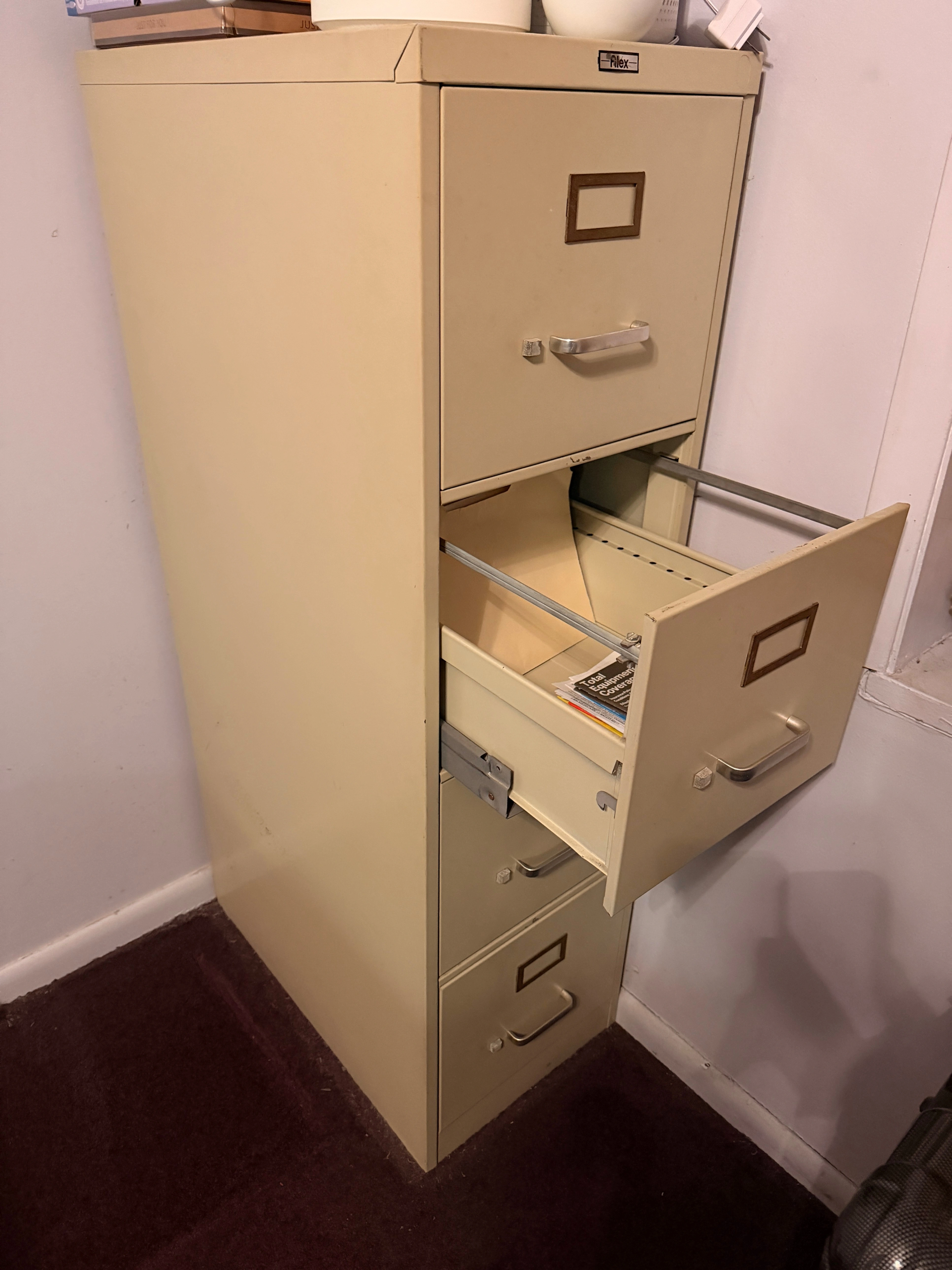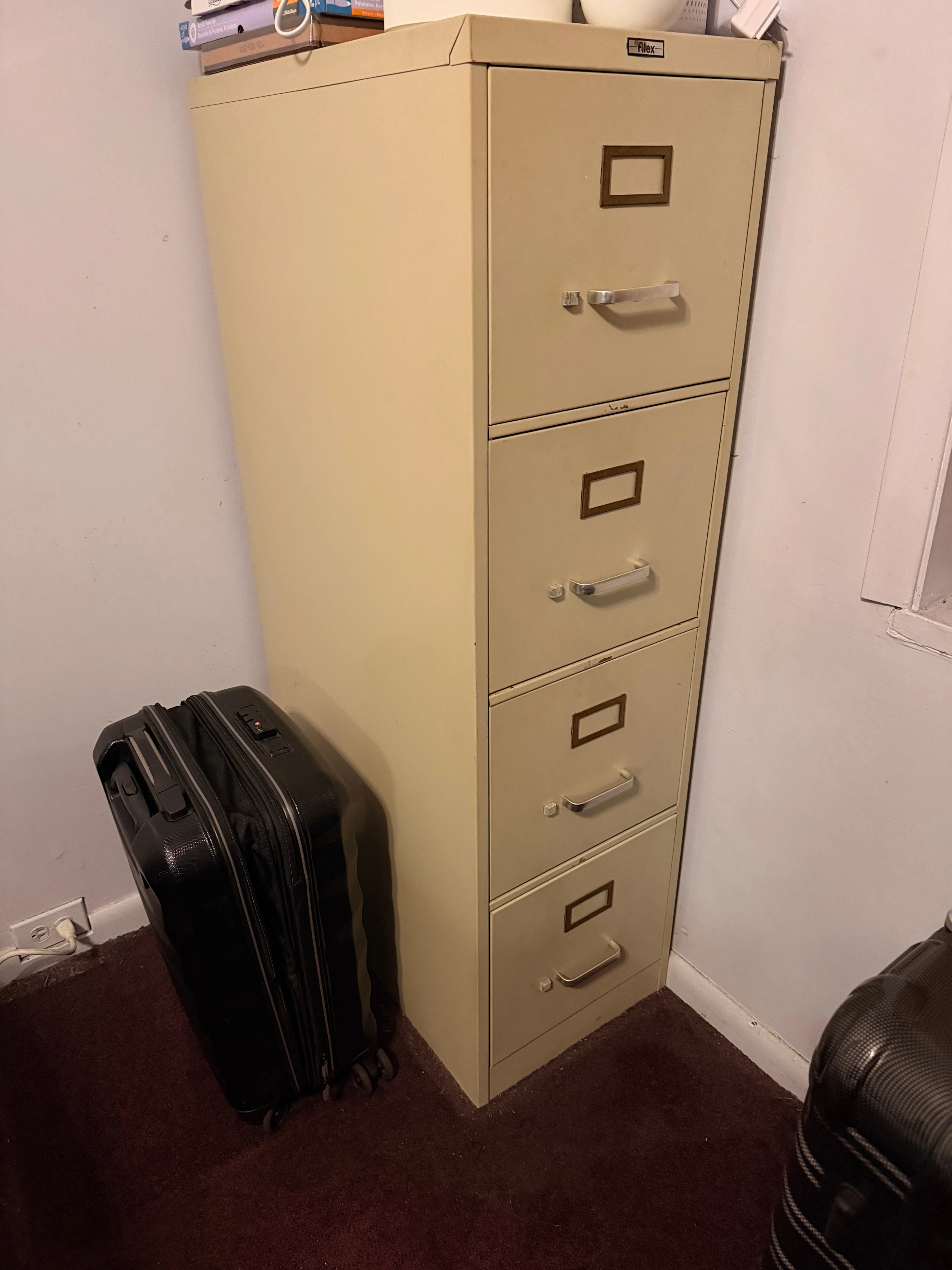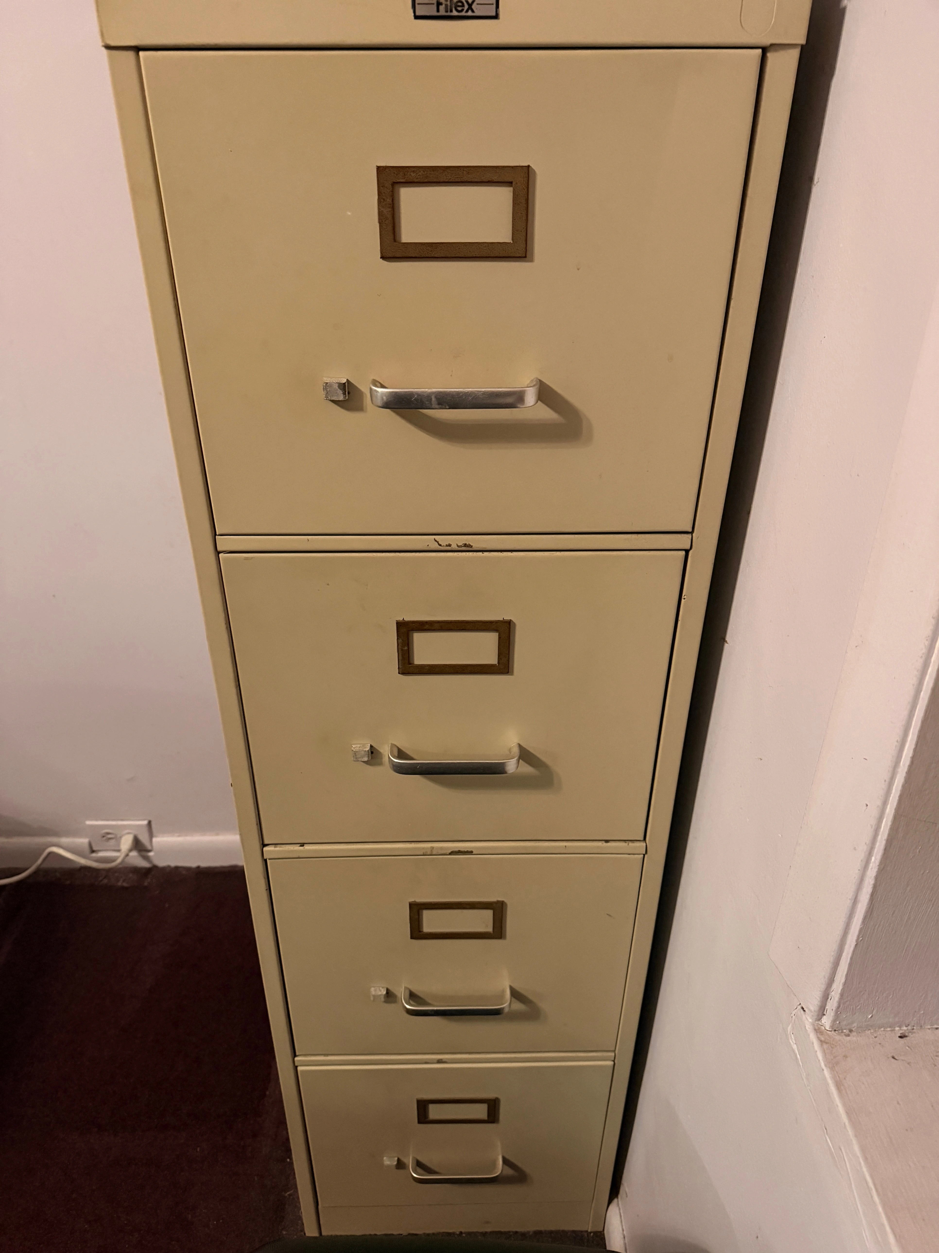 26Filing cabinet used for storing paperwork. In good condition. All drawers work perfect. PICK UP ONLY!!! Price is negotiable. Willing to assist in carrying downstairs to your car. W = 15 D = 25 H = 51.5
