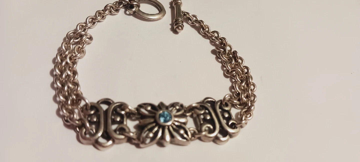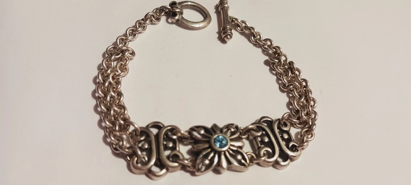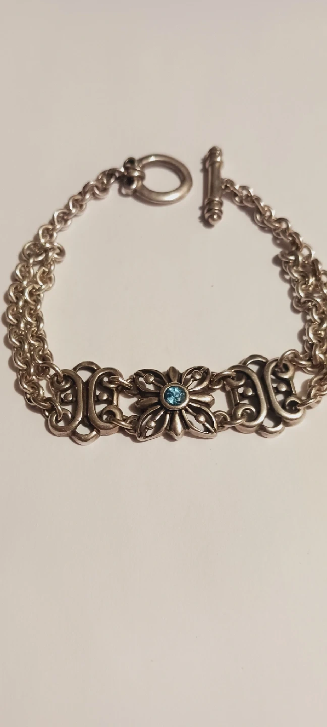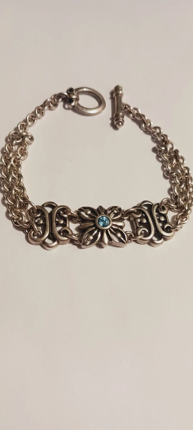 1000+FINESTRA 925 SIGNED STERLING SILVER 925 BLUE GEMSTONE BRACELET. Selling Sterling silver bracelet with a flower design. It has a toggle clasp and a blue stone in the center of the flower. Excellent condition. 7" long. ALL MY PRICES ARE NEGOTIABLE !!