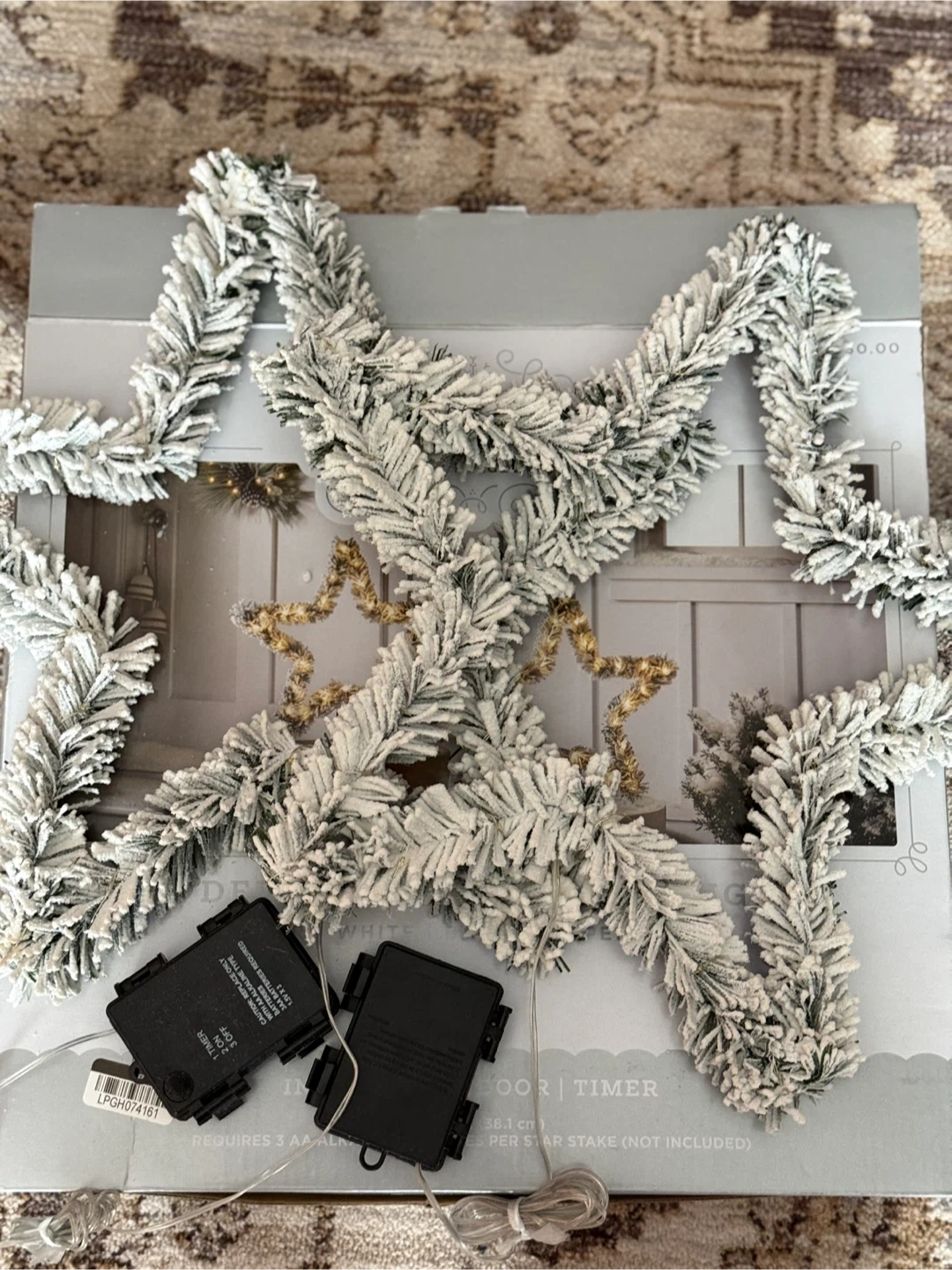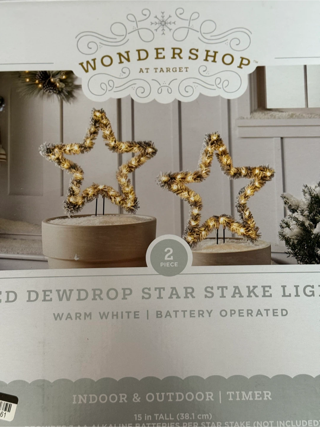 Selling a set of Wondershop LED dewdrop star stake lights! These are brand new and still in the box. They're warm white and battery operated. Perfect for indoor or outdoor use, and they even have a timer! Each star stake is 15 inches tall (38.1 cm).