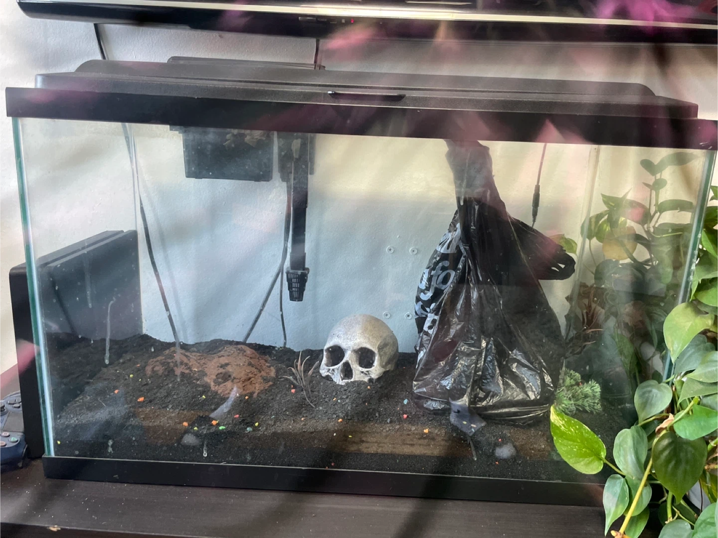 I'm selling a used fish tank. It comes with the filter and some decor. It's all set up and ready to go for your fishy friends!