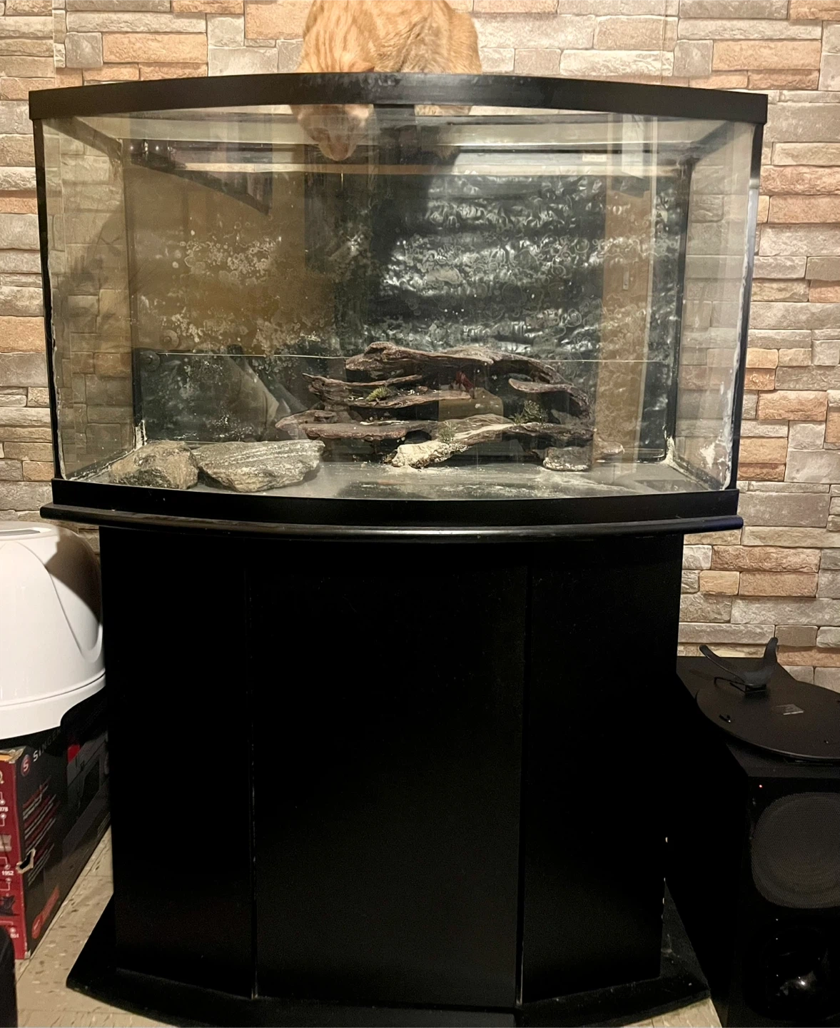 60Selling a used fish tank, complete with a stand and various accessories. Includes river stones (stone size 6-8cm, weight 5lbs), black rocks (5lbs), a 400gls filter, automatic feeder, flakes and krill food and a water conditioner, Perfect for setting up your aquarium!