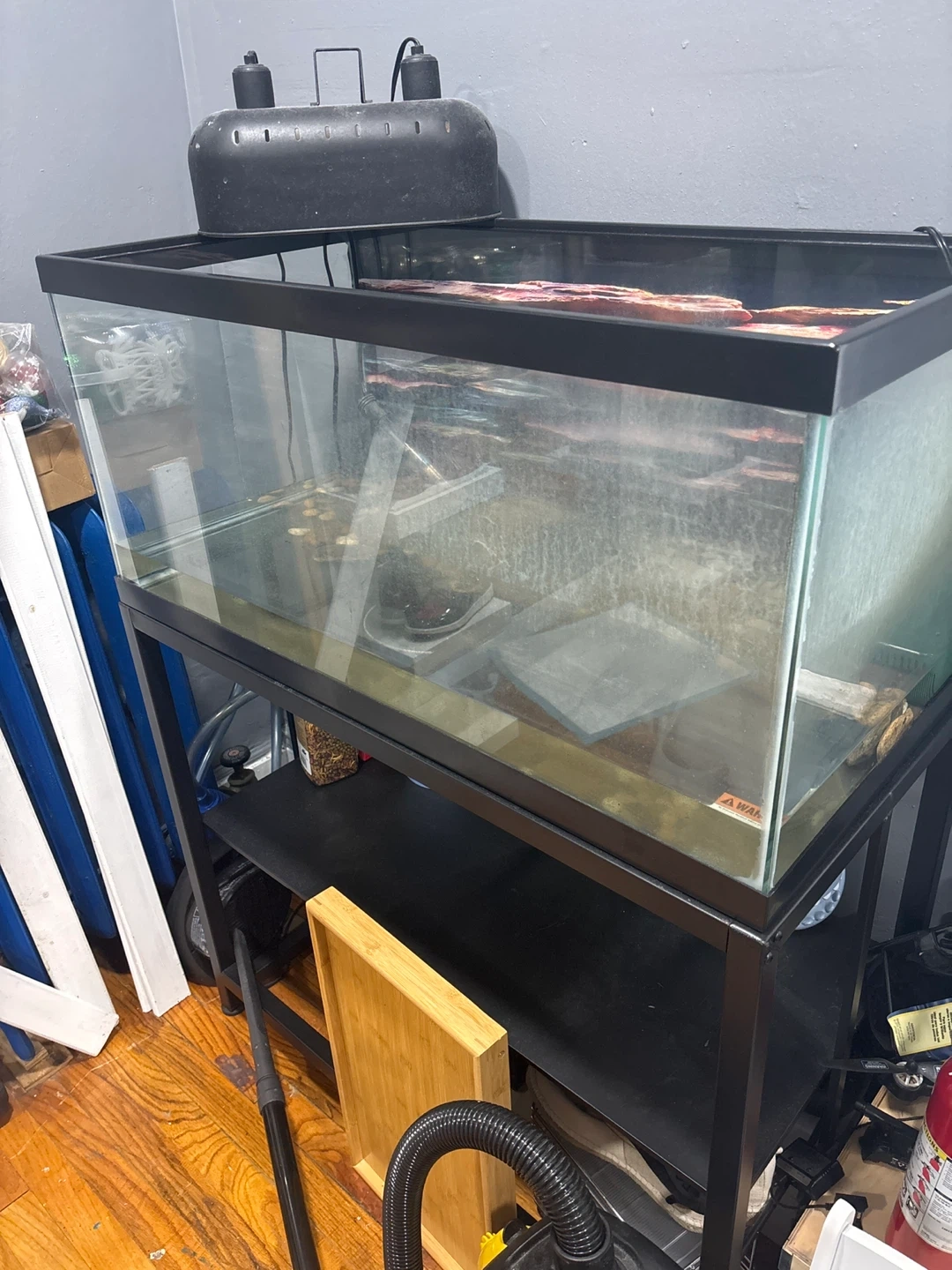 Selling a used fish tank that comes with a stand. It's a great setup for anyone looking to start or upgrade their aquarium. Please note that the tank shows signs of use.