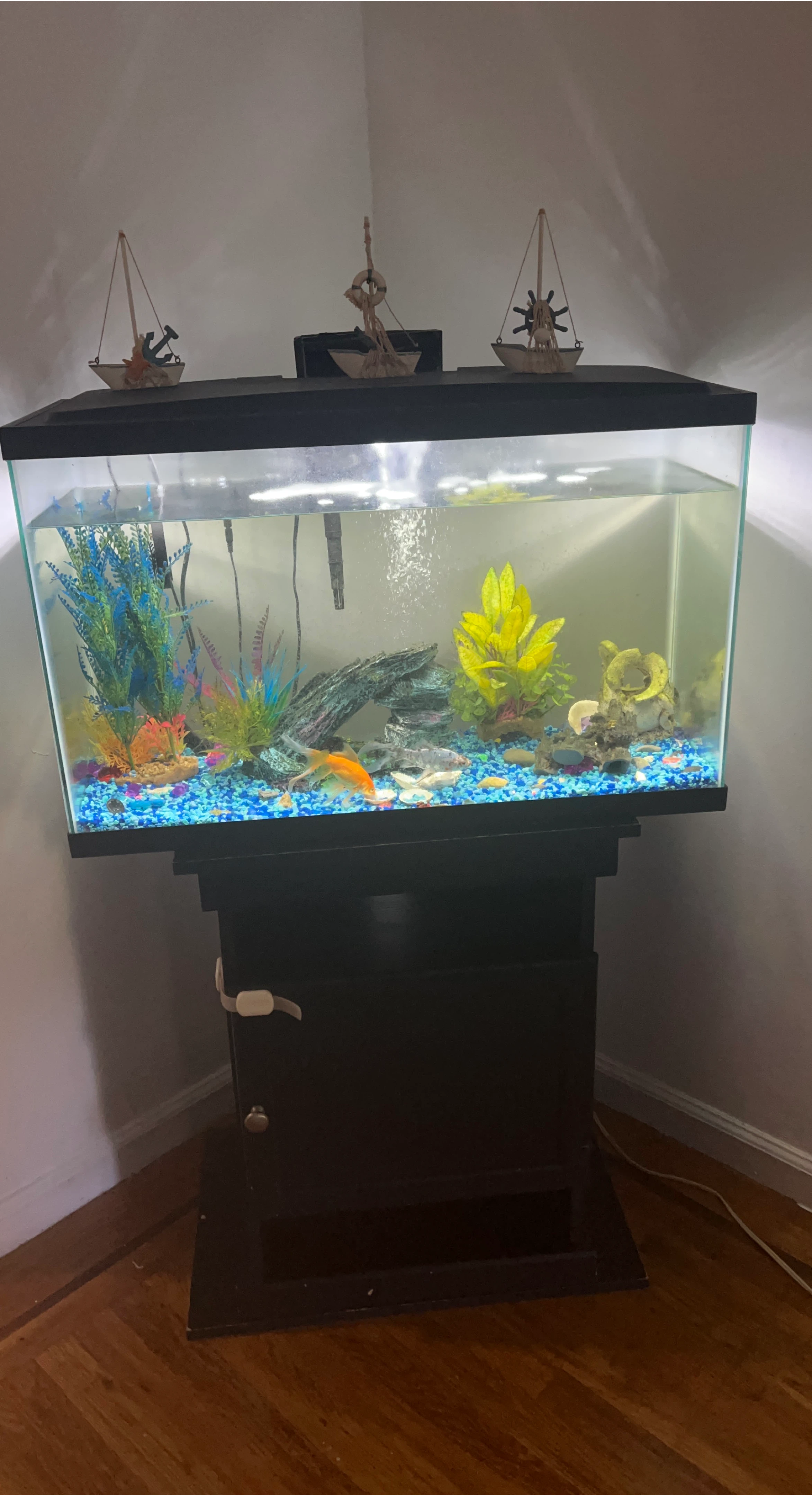 Selling a fish tank with a stand. It comes with decorations and gravel. Perfect for your aquatic pets! Also comes with 2 fishes Fish tank is 80 gallons .