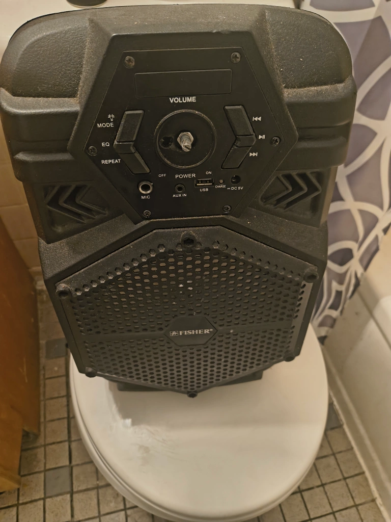 Selling a Fisher portable speaker. It has a volume control, mode, EQ, and repeat buttons. It also has ports for mic, aux in, and USB.