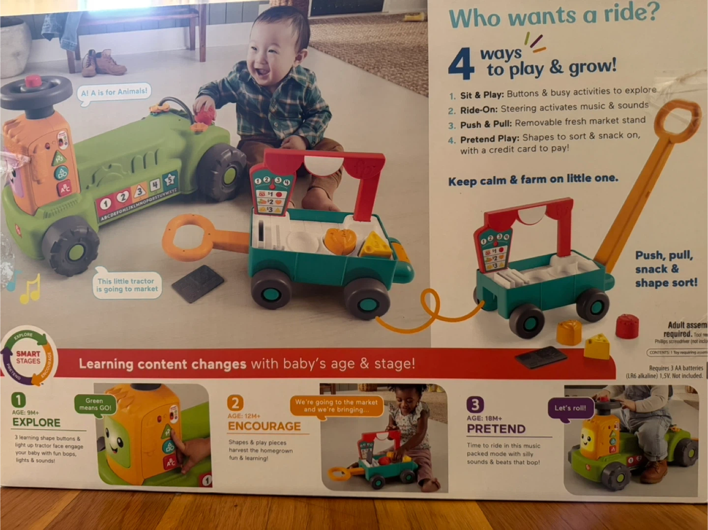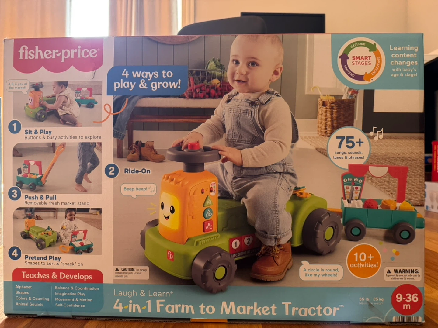 65The Fisher-Price Laugh & Learn 4-in-1 to Market Tractor is perfect for little ones aged 9-36 months! It has 4 ways to play and grow, including sit & play, ride-on, push & pull, and pretend play. It teaches shapes, colors, counting, and animal sounds. This tractor also helps develop balance & coordination, imagination, movement & motion, and self-confidence. It features over 75+ songs, sounds, tunes & phrases and 10+ activities