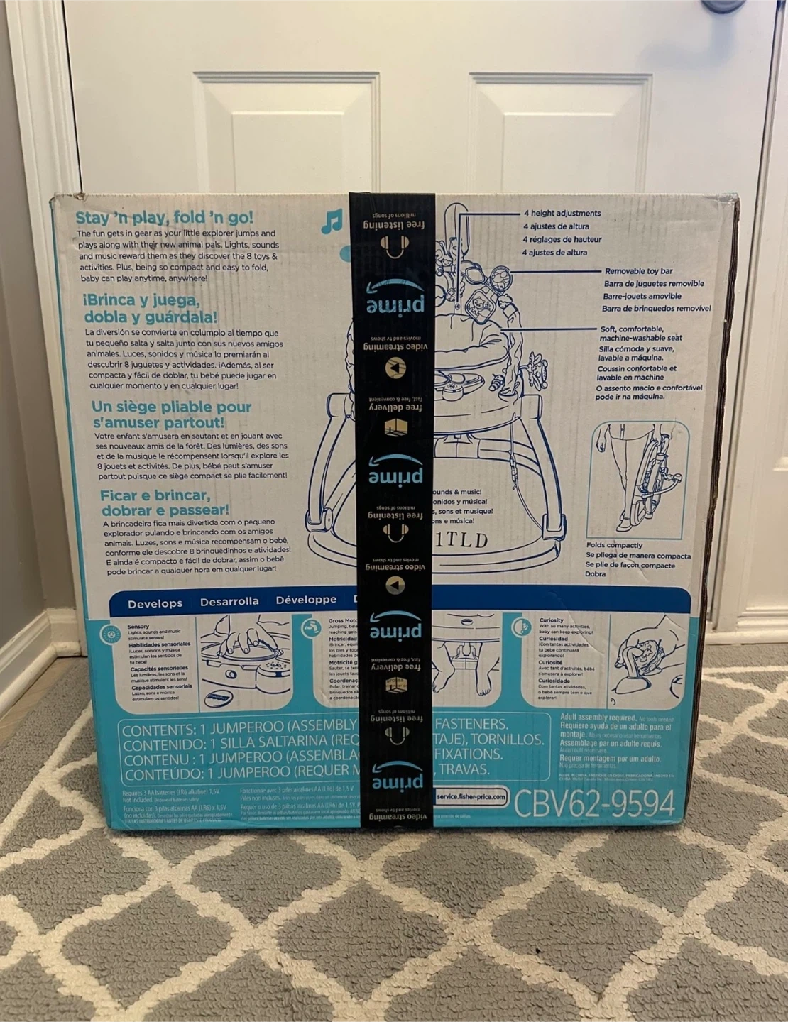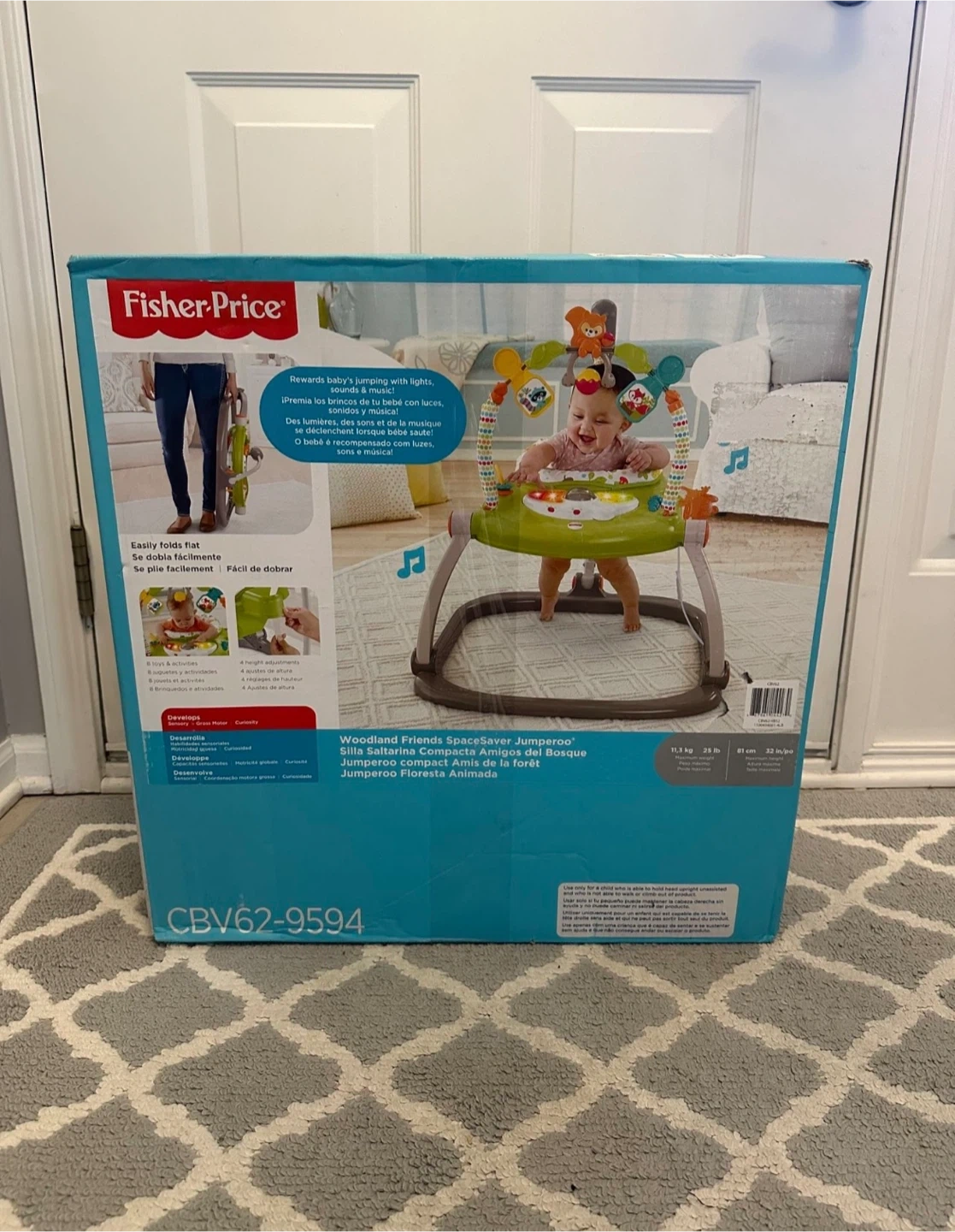 Retails for $80 plus taxes on Amazon Im asking $60 Brand new in the box It was a gift from my wifes and I babyshower. We had 2 gifted to us and we forgot to return it on the registry. With the Fisher-Price Sweet SnugaPuppy SpaceSaver Jumperoo activity center, your baby can bounce into action! This Snugapuppy-themed activity center offers 360 degrees of activities, including a toy bar loaded with spinners, clackers and lots of fun lights, music and sounds. Your little one can jump to their heart’s content – working on those gross motor skills as they do! The seat adjusts to four different heights, so your little one can keep bouncing as they grow. This activity center features a compact, space-saving frame that easily folds for storage or travel. Plus, the puppy seat pad is machine washable for easy cleaning. Style: Snugapuppy • Compact baby activity center with music, sounds, lights, and toys ready for bouncy fun • Toy bar full of toys including bat-at paddle and roller ball; plus, clicker and teether on the platform • Conveniently adjusts to four different heights as baby grows • Making it easy! Soft, puppy-themed seat pad is removable and machine washable and frame easily folds for travel and storage Pickup in Romeoville, IL