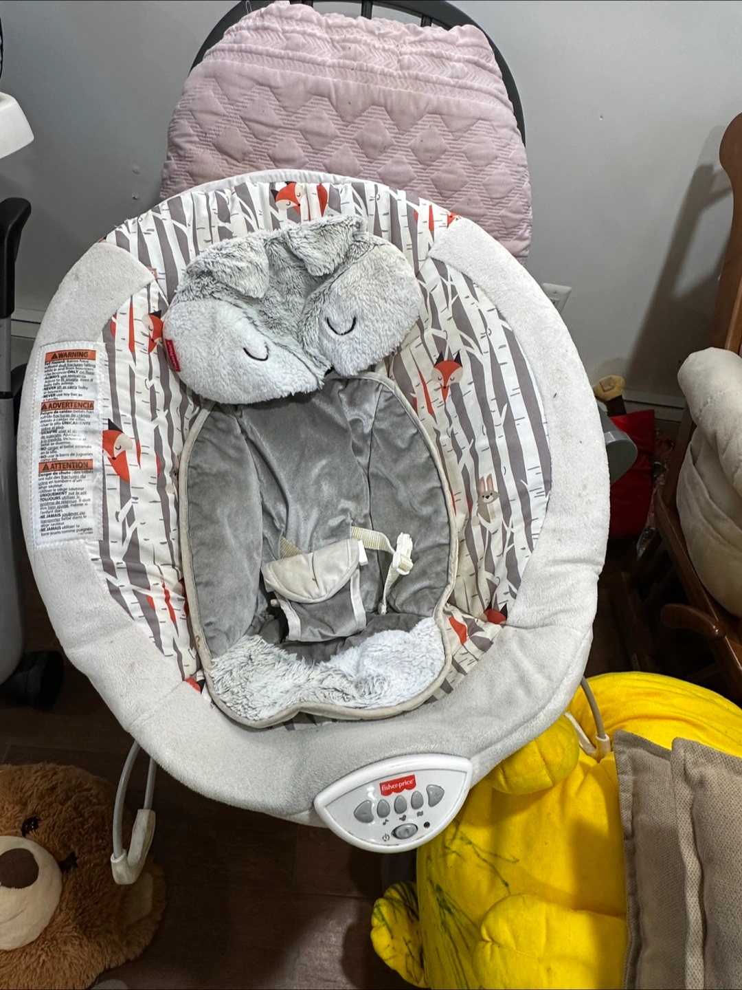 Selling a Fisher-Price baby bouncer. It has a cute fox design and a comfy seat for your little one. Perfect for keeping baby entertained and relaxed!