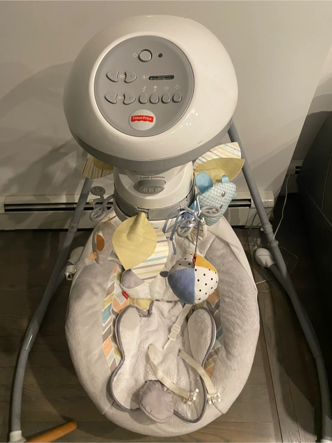 Gently used Fisher-Price baby swing in good condition. It features a variety of soothing motions and sounds to comfort your little one. Comes with attached toys to keep baby entertained!