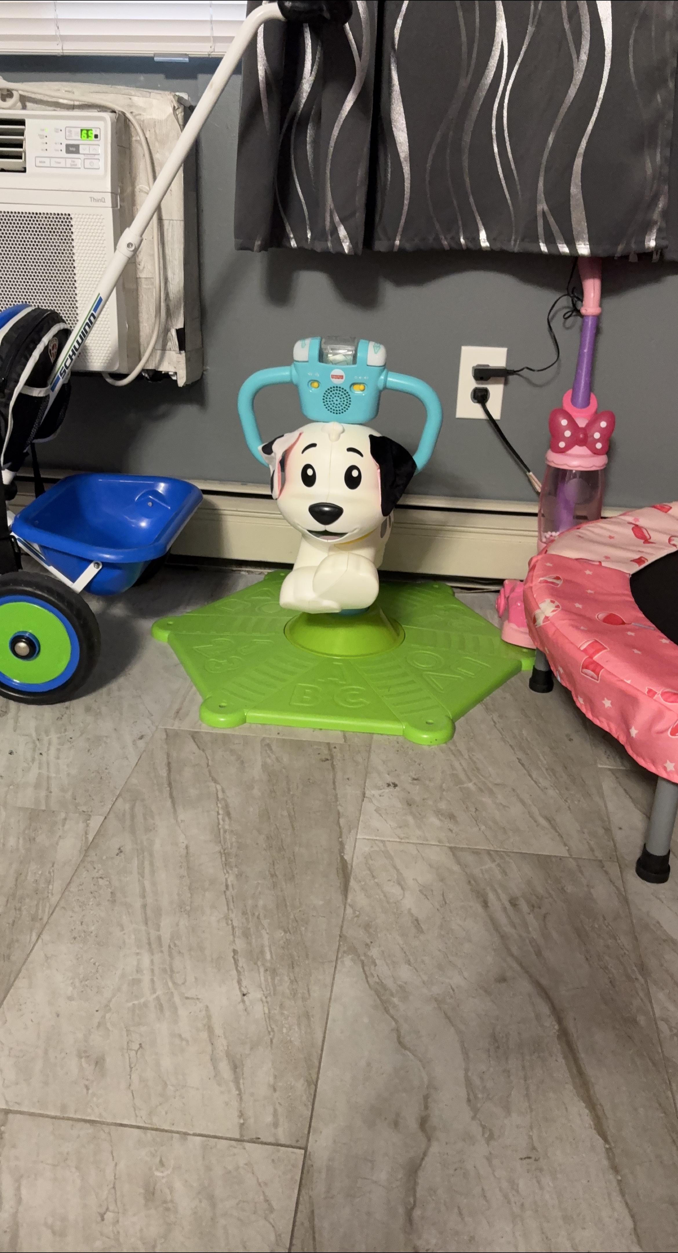 The Fisher-Price Bouncetopia Jumperoo features a fun puppy theme! It includes a bouncy seat on a green base with a cute dog figure. The toy also has an overhead bar with interactive elements for your little one to enjoy