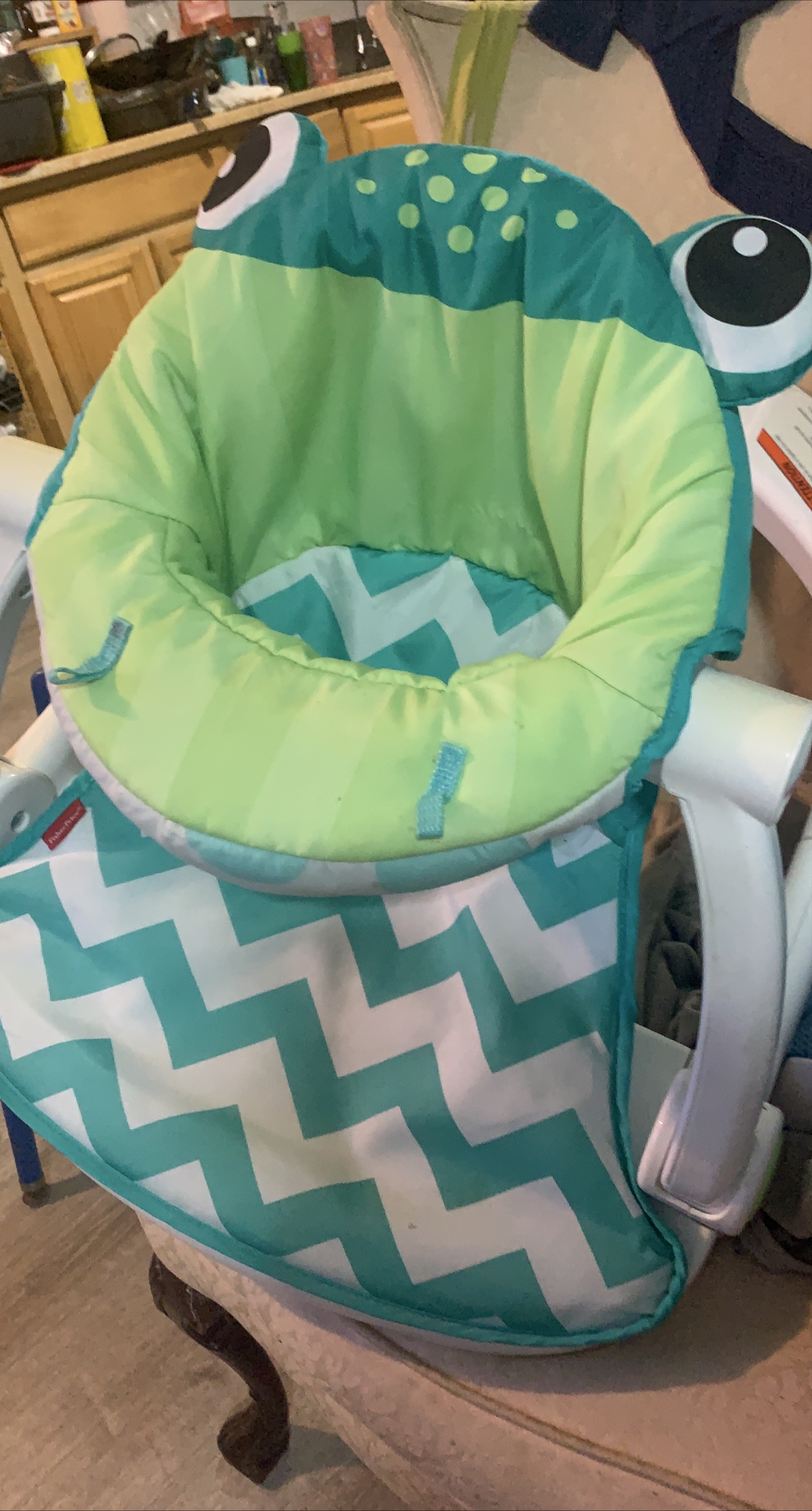 Here is a cute Fisher-Price high chair seat pad! It features a fun frog design with green and white chevron pattern. Perfect for adding some fun to mealtime!