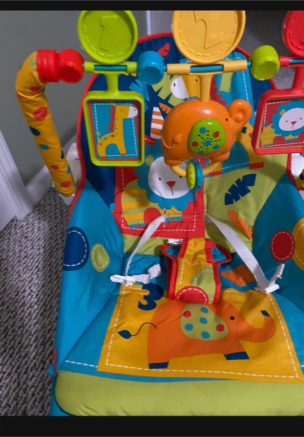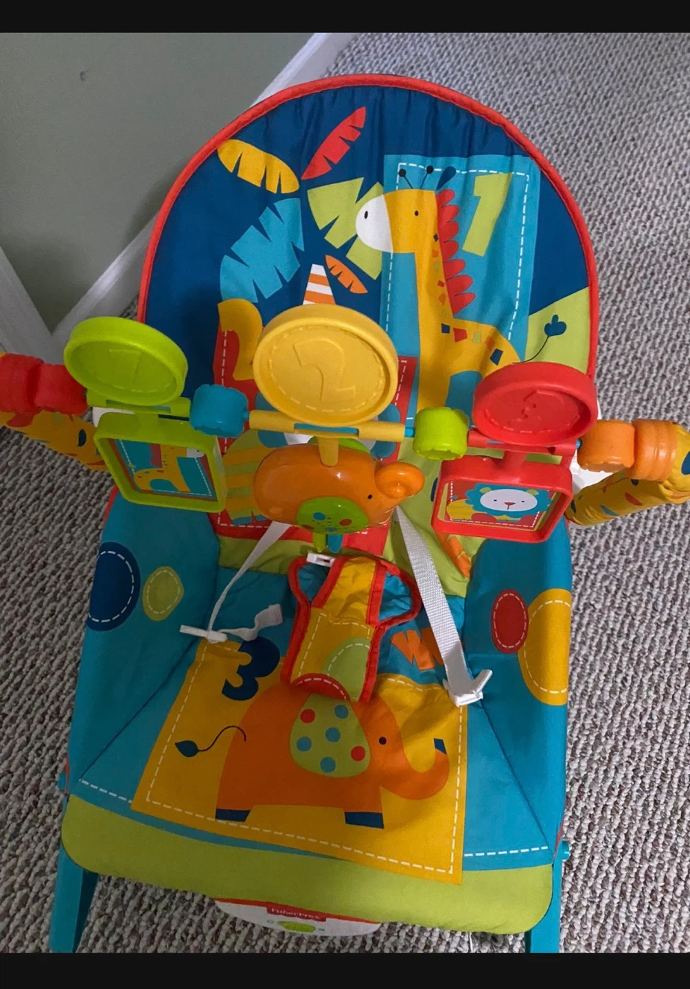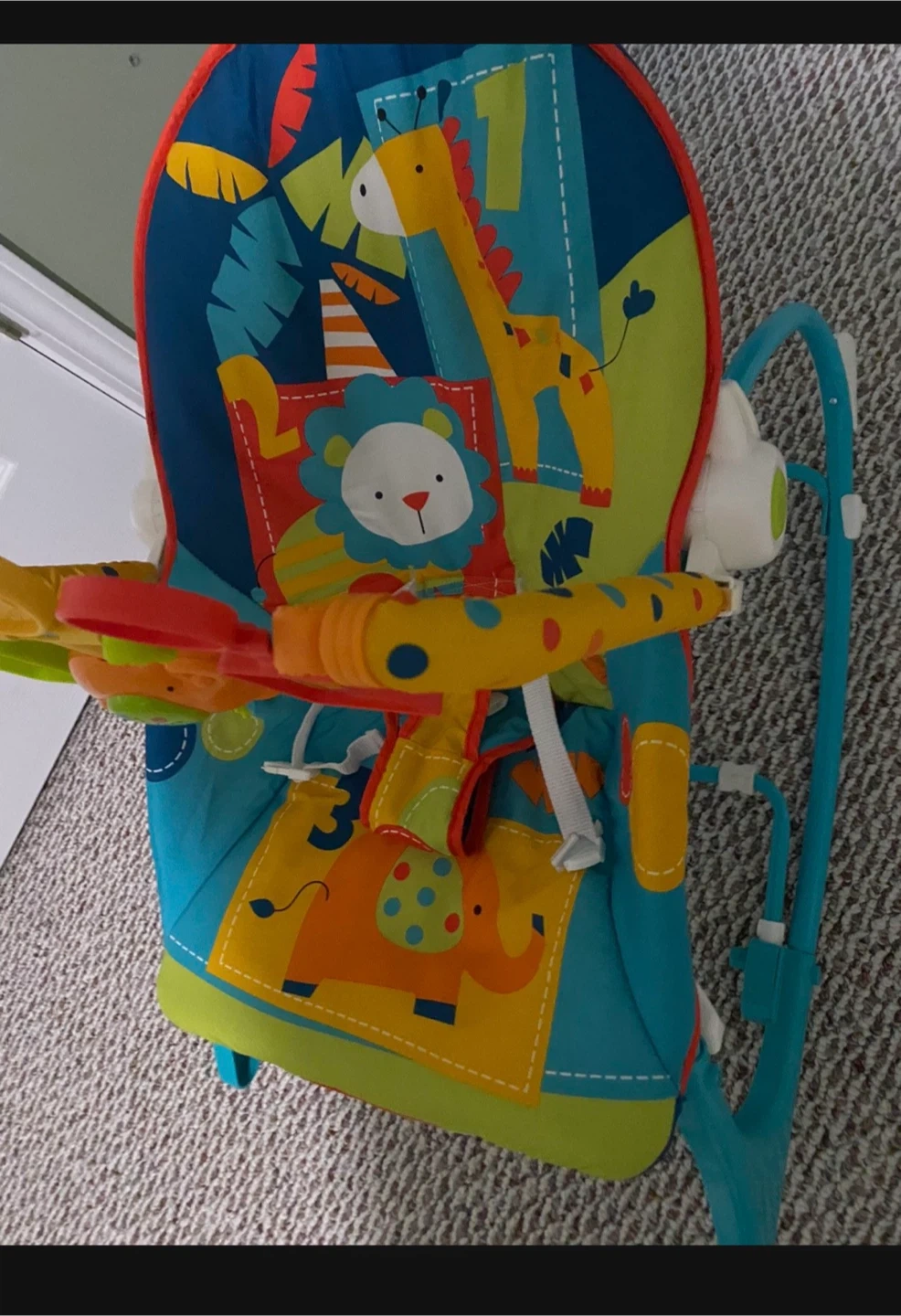 10Selling a Fisher-Price baby bouncer in great condition! It's perfect for keeping your little one entertained and comfortable. The bouncer features a colorful design with fun animal characters. Recommended age range is for newborns and up. It's lightweight and easy to move around the house