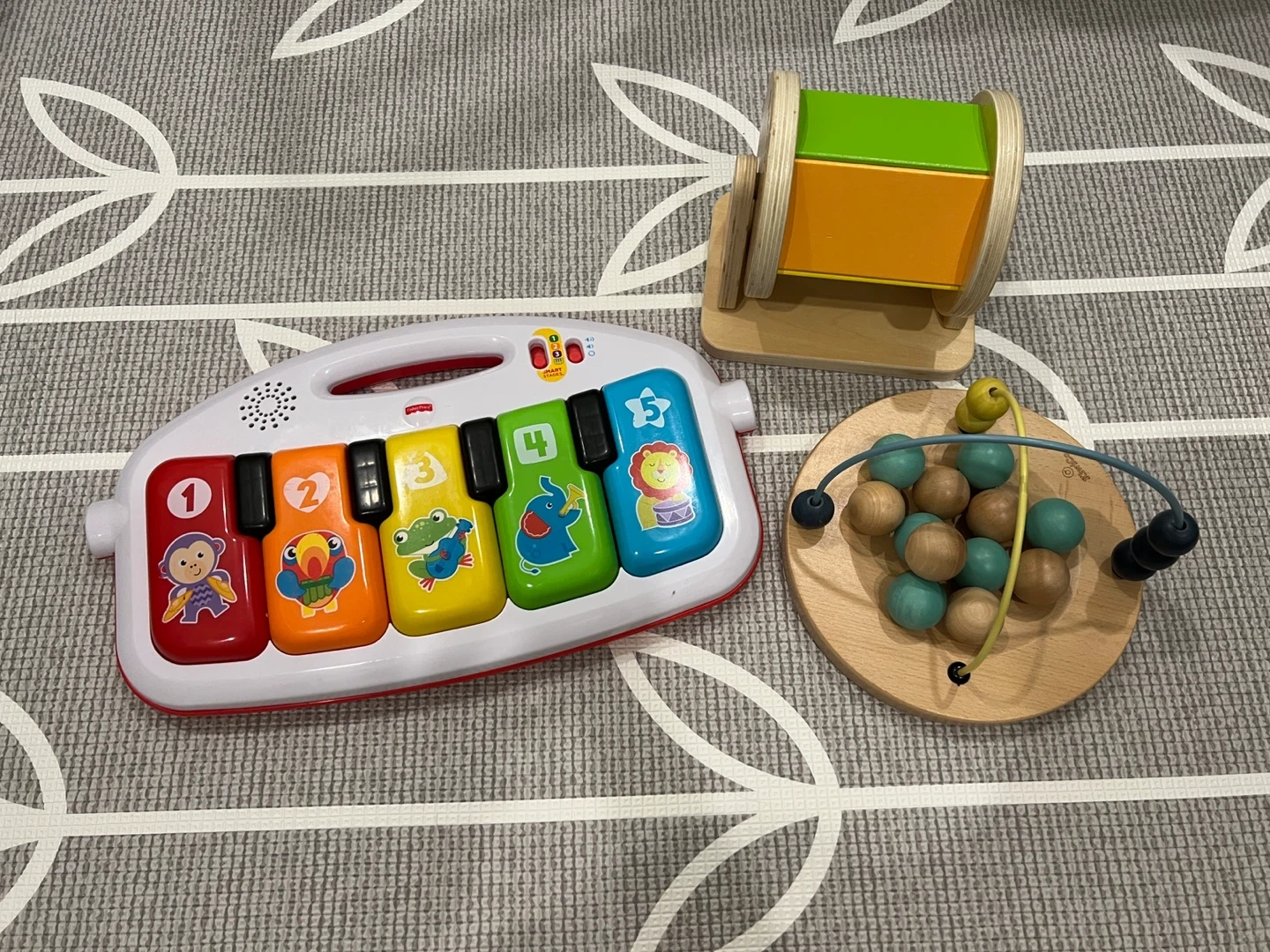 Selling a Fisher-Price piano along with two other wooden toys! They're perfect for little ones who are just starting to explore sounds and textures. The piano has colorful keys with animal illustrations, making it fun and engaging. The wooden toys are great for developing fine motor skills and hand-eye coordination