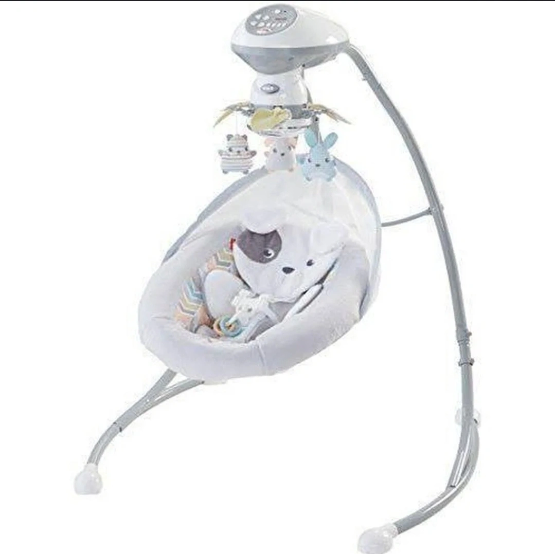 10Baby swing, gray and white. Features overhead mobile with plush toys. Calming vibrations. Gently used.