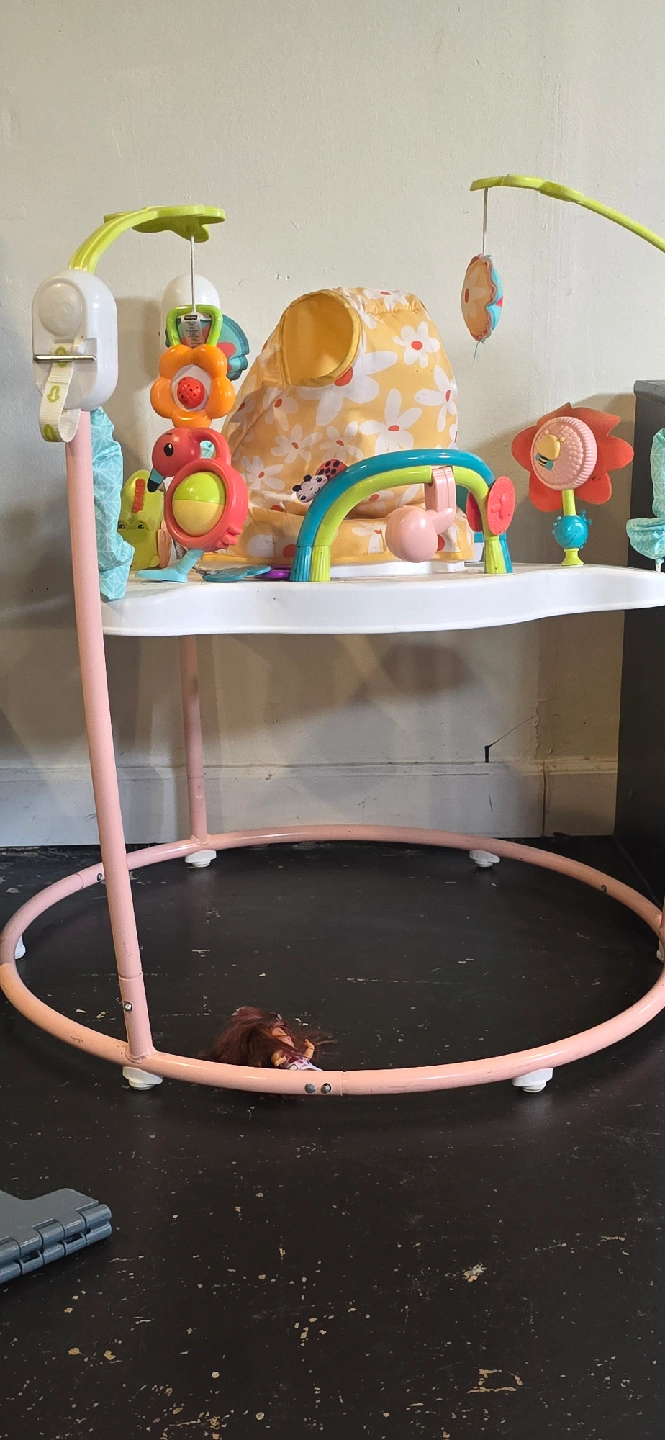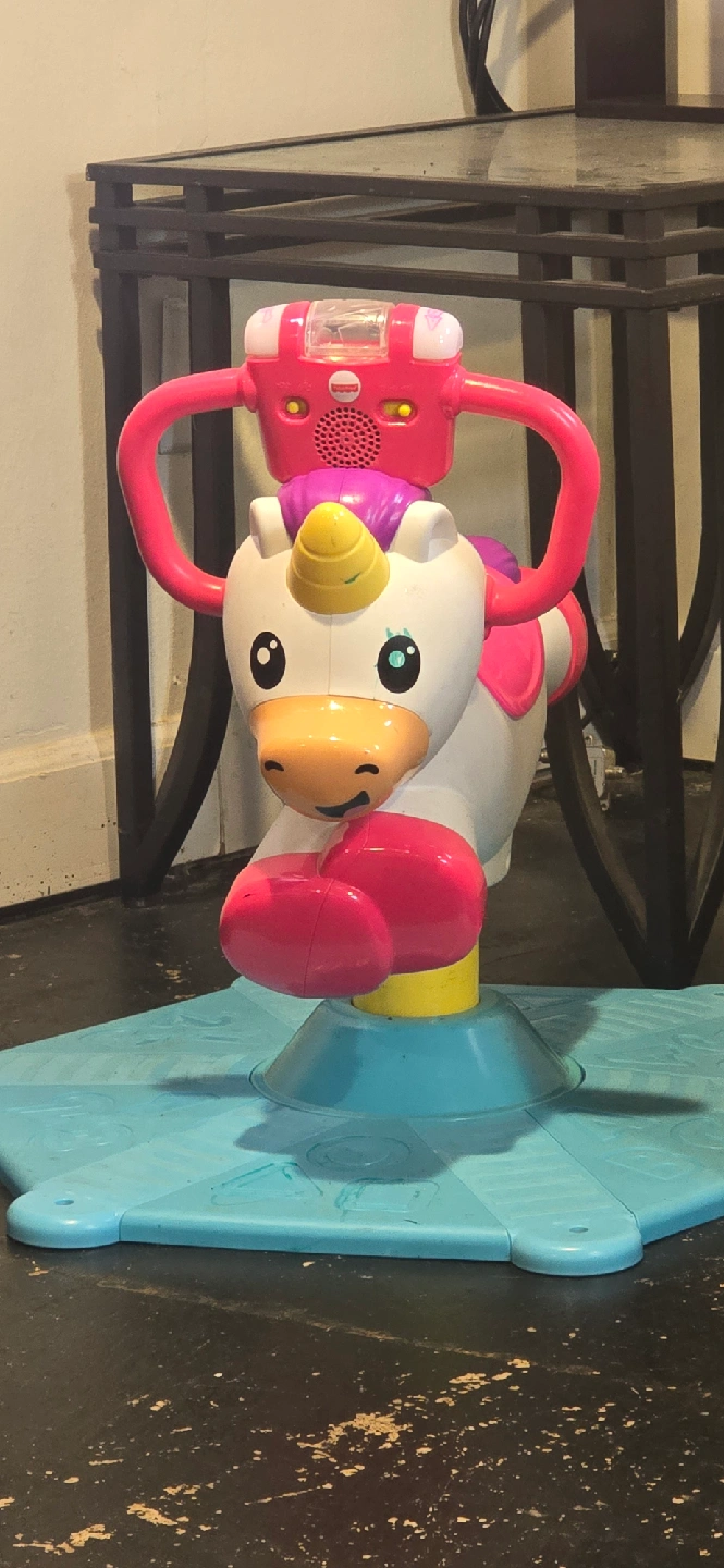 5I'm selling a Fisher-Price Unicorn Jumperoo! It's in great condition and ready for a new home. This jumperoo is perfect for keeping your little one entertained and active. It features a cute unicorn design and interactive toys to stimulate your baby's development