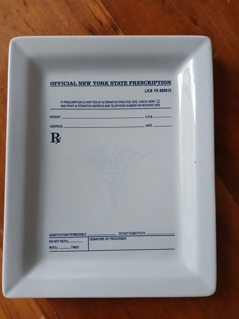 Here's a fun Fishs Eddy (NYC) plate modeled on a New York Stste prescription pad! Light blue ceramic measures 5.5" x 7" Perfect for adding a quirky touch to your kitchen or as a unique gift.