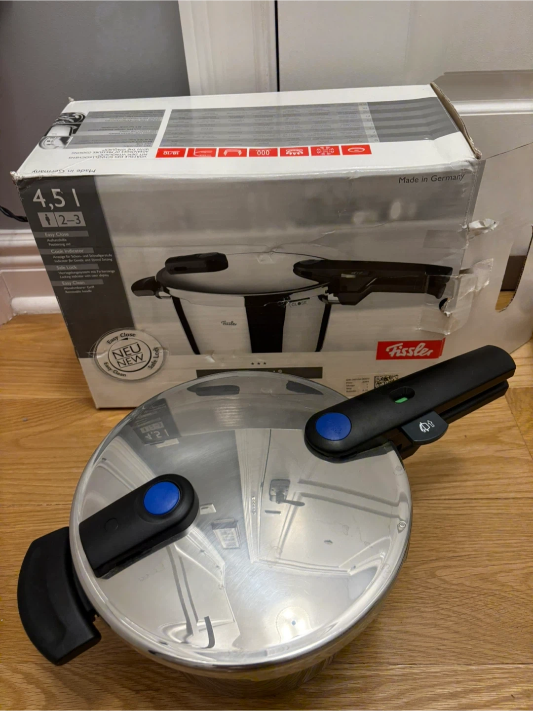 Selling a Fissler pressure cooker in excellent condition! It's a 4.5L capacity, perfect for cooking delicious meals quickly and easily. The box is included, making it easy to store when not in use. This cooker is known for its quality and durability, making it a great addition to any kitchen!