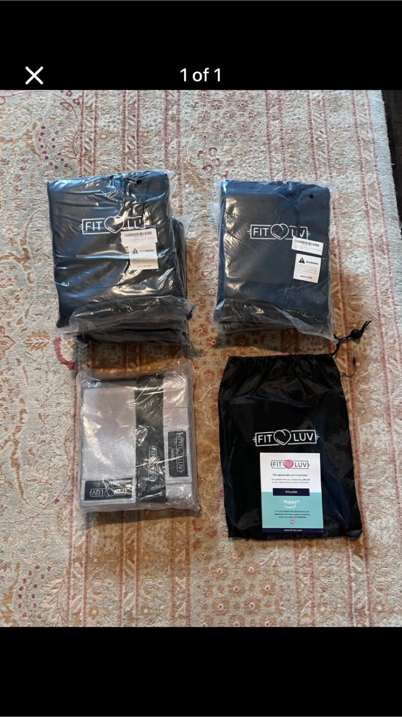 New Fit Luv resistance bands, workout set, and carrying bag. Includes multiple resistance bands and a drawstring bag. All items are unopened. 6 sets of 5 bands