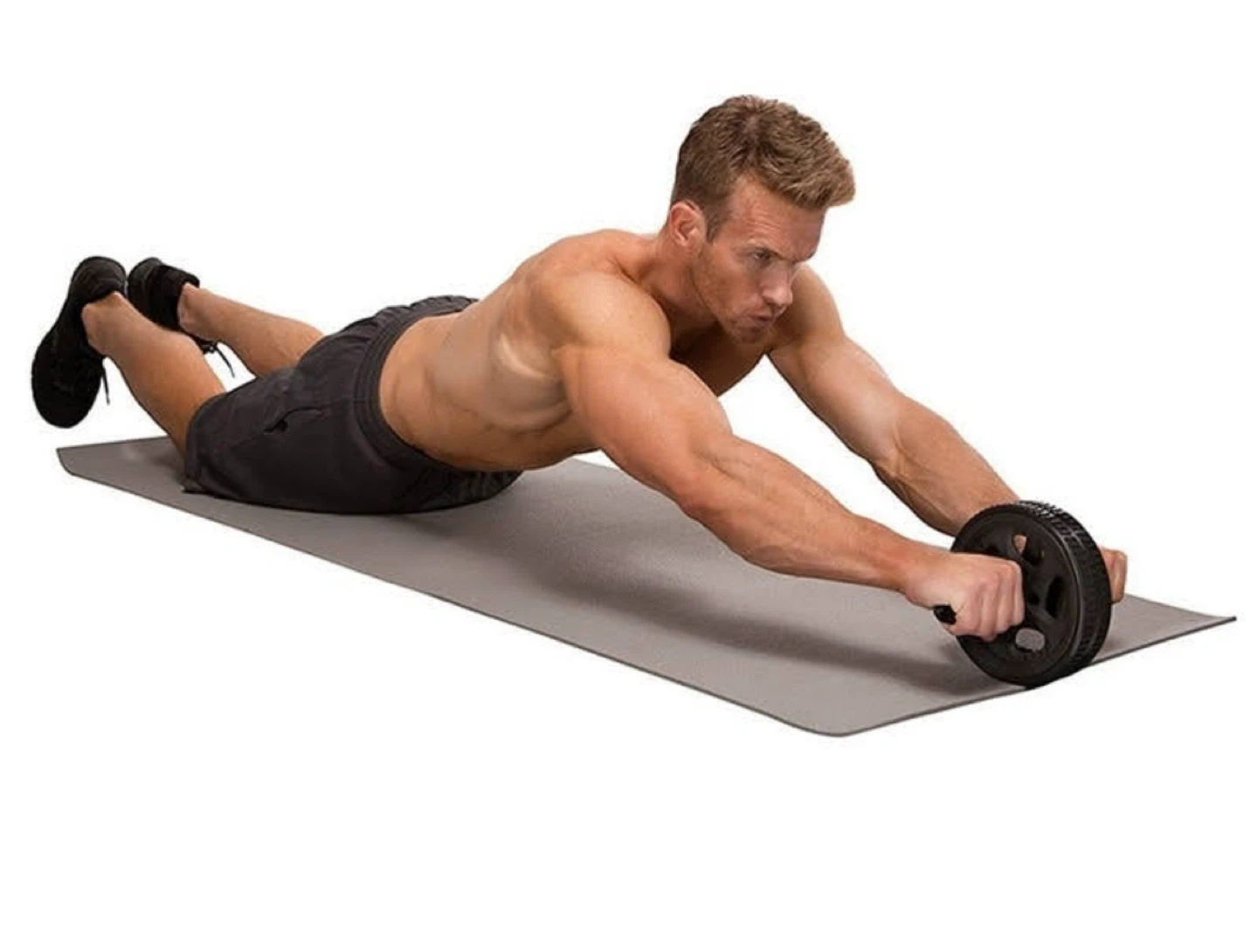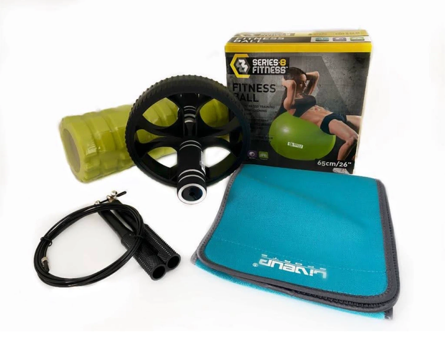 10Selling a bundle of fitness equipment! Includes a jump rope with black handles, an ab roller, and a yellow foam roller. Also included is a blue exercise towel and a NordicTrack waist trimmer.
