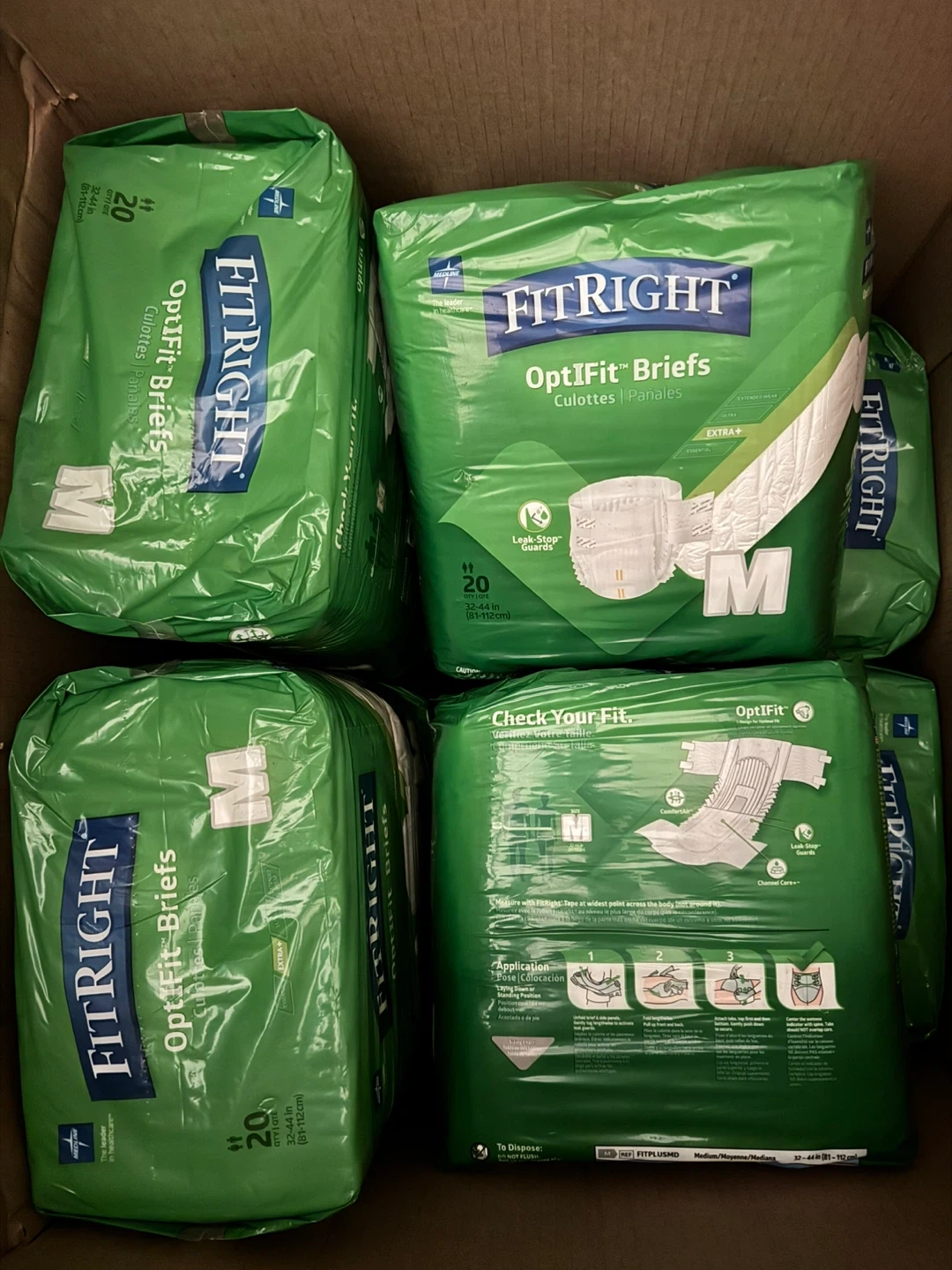 10I have FitRight OptiFit Briefs in size medium. Each pack contains 20 briefs. They are designed for extended wear and feature leak-stop guards. Check your fit for comfort and confidence! 2-packs $15 Delivery available