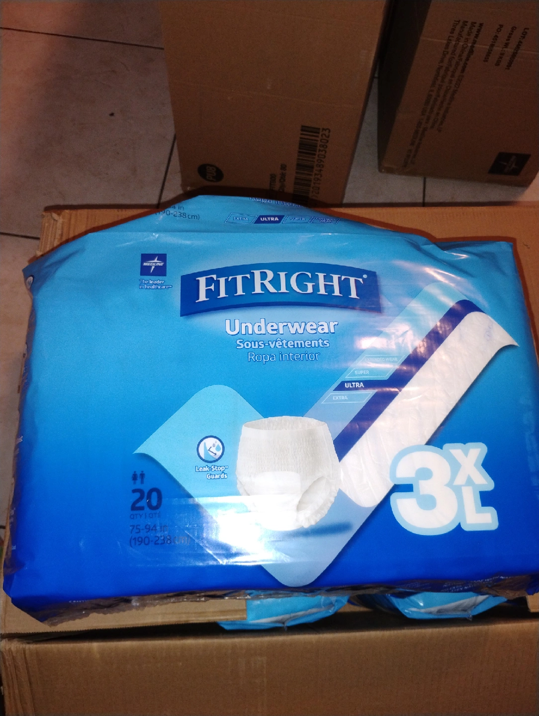 60Selling a pack of FitRight Underwear, size 3XL. These are designed for individuals with a waist size of 75-94 inches (190-238 cm). This package contains 20 pairs of underwear with Leak-Stop Guards for extra protection 12 packs
