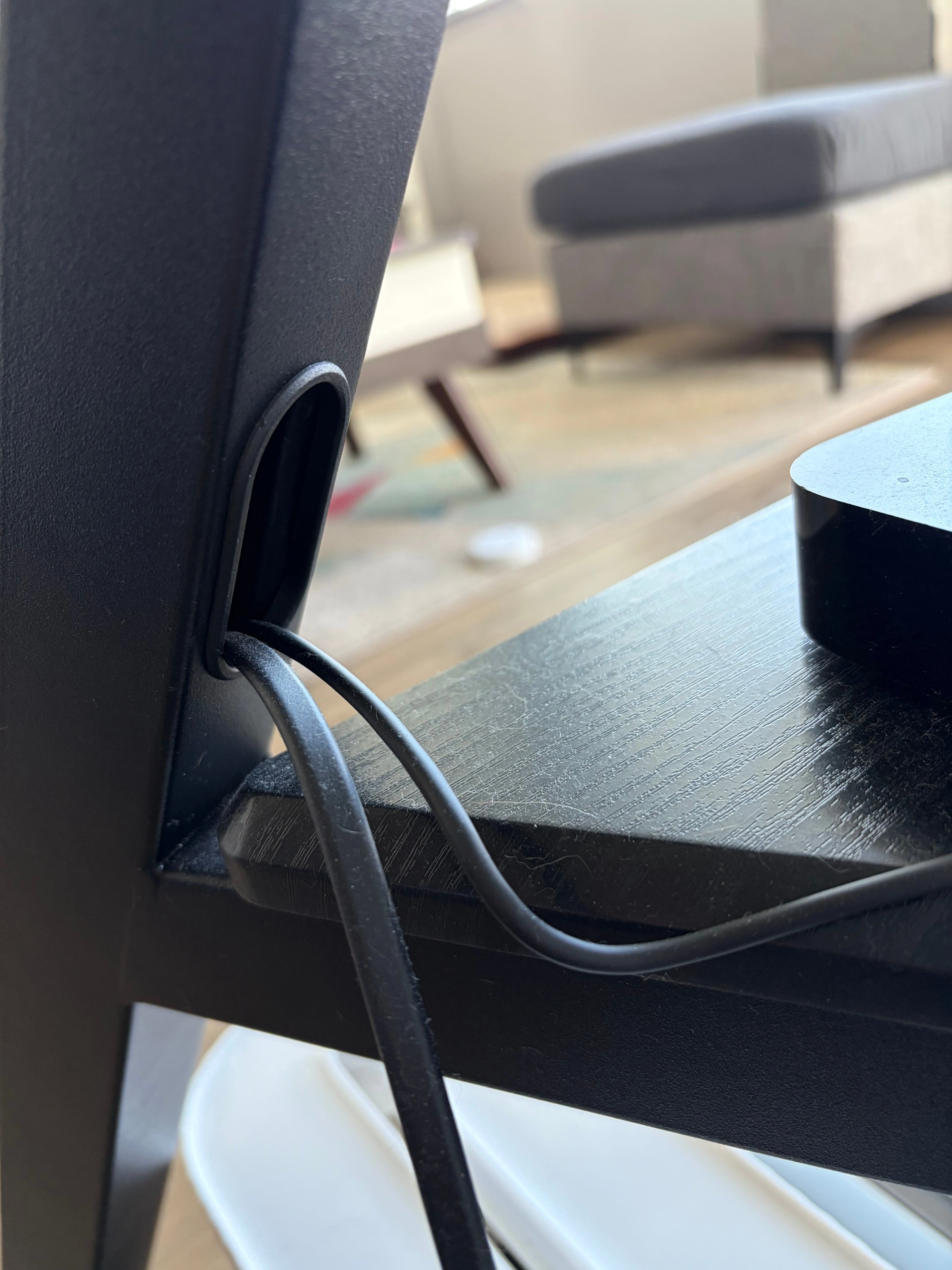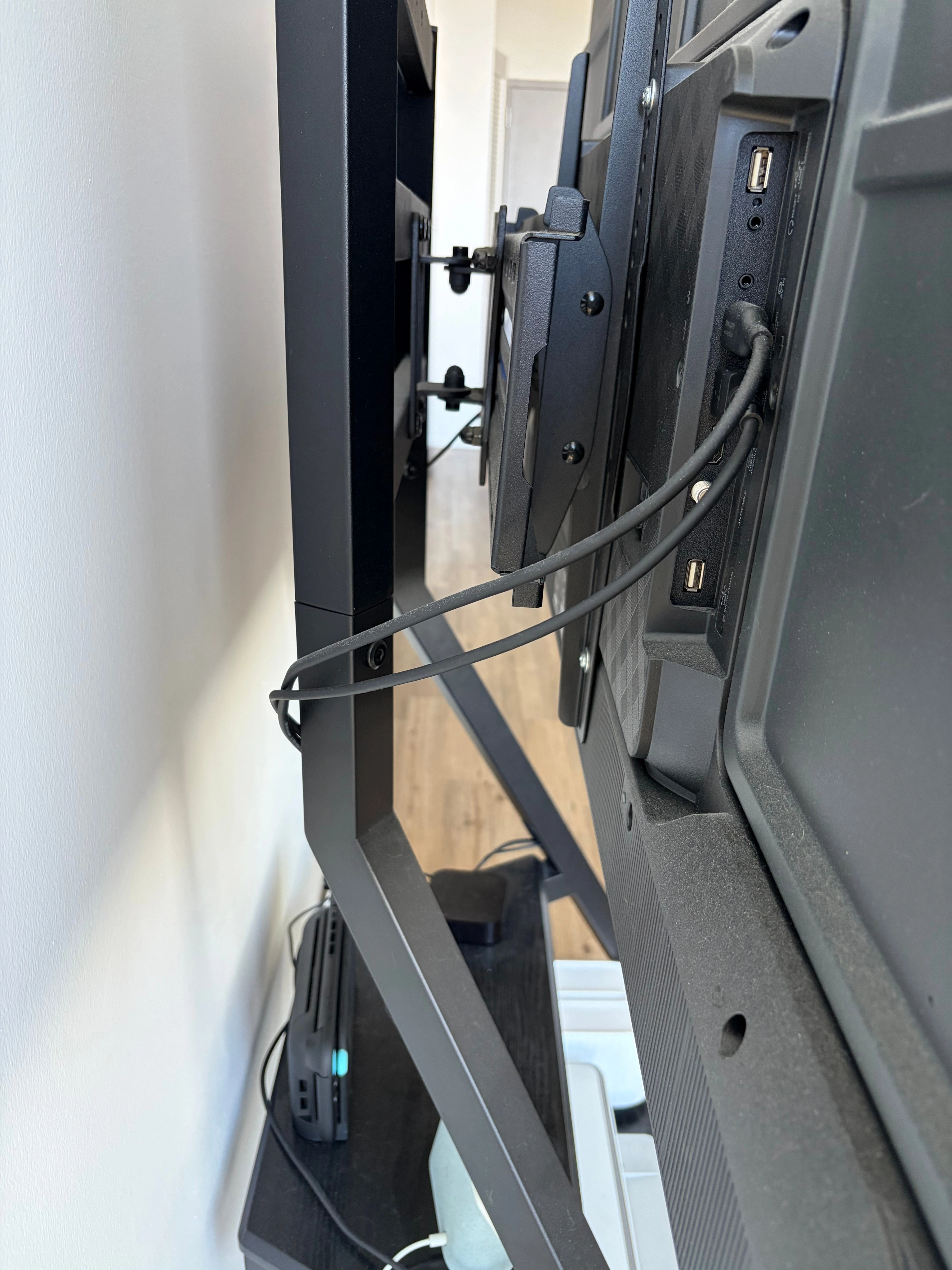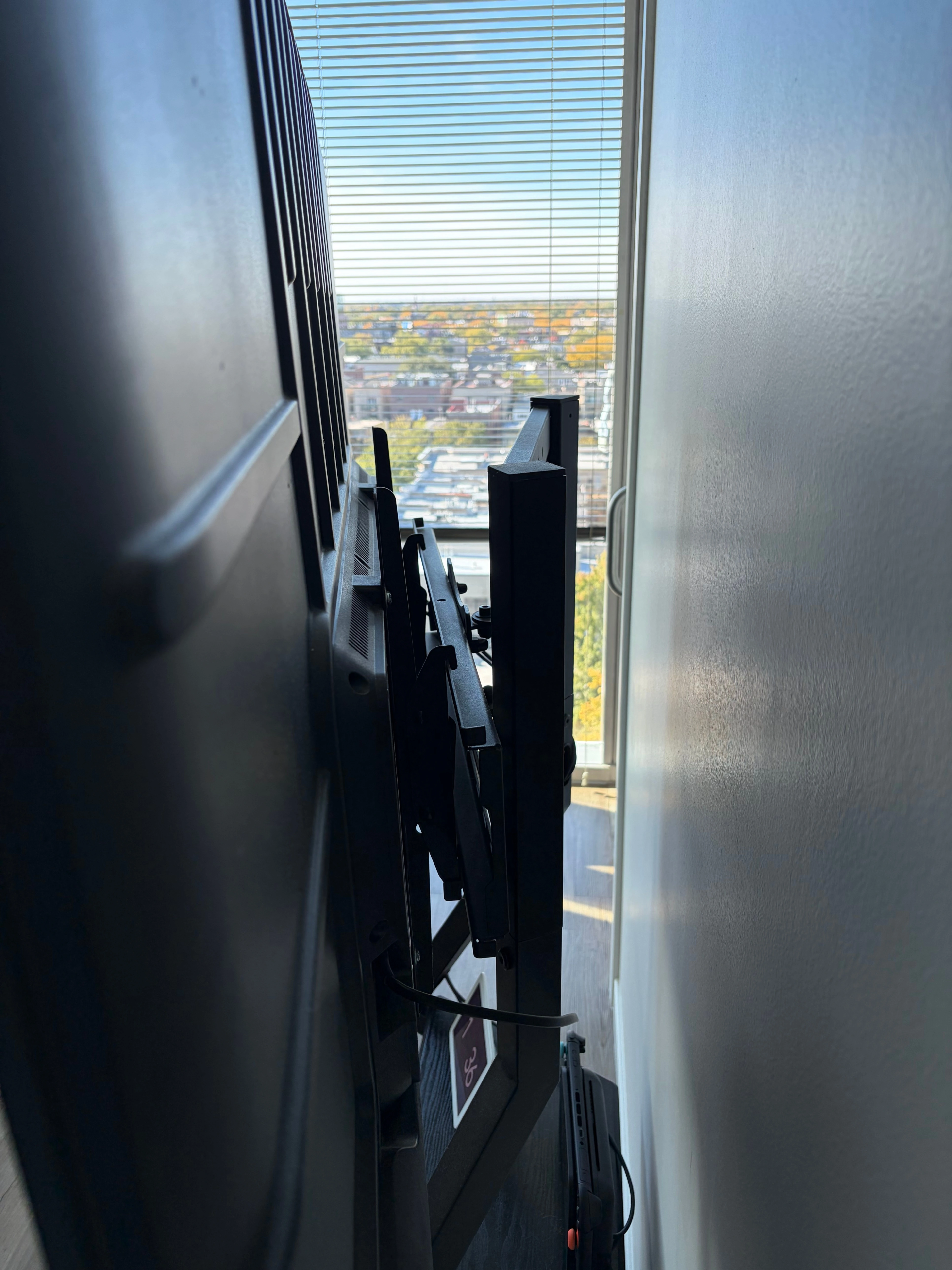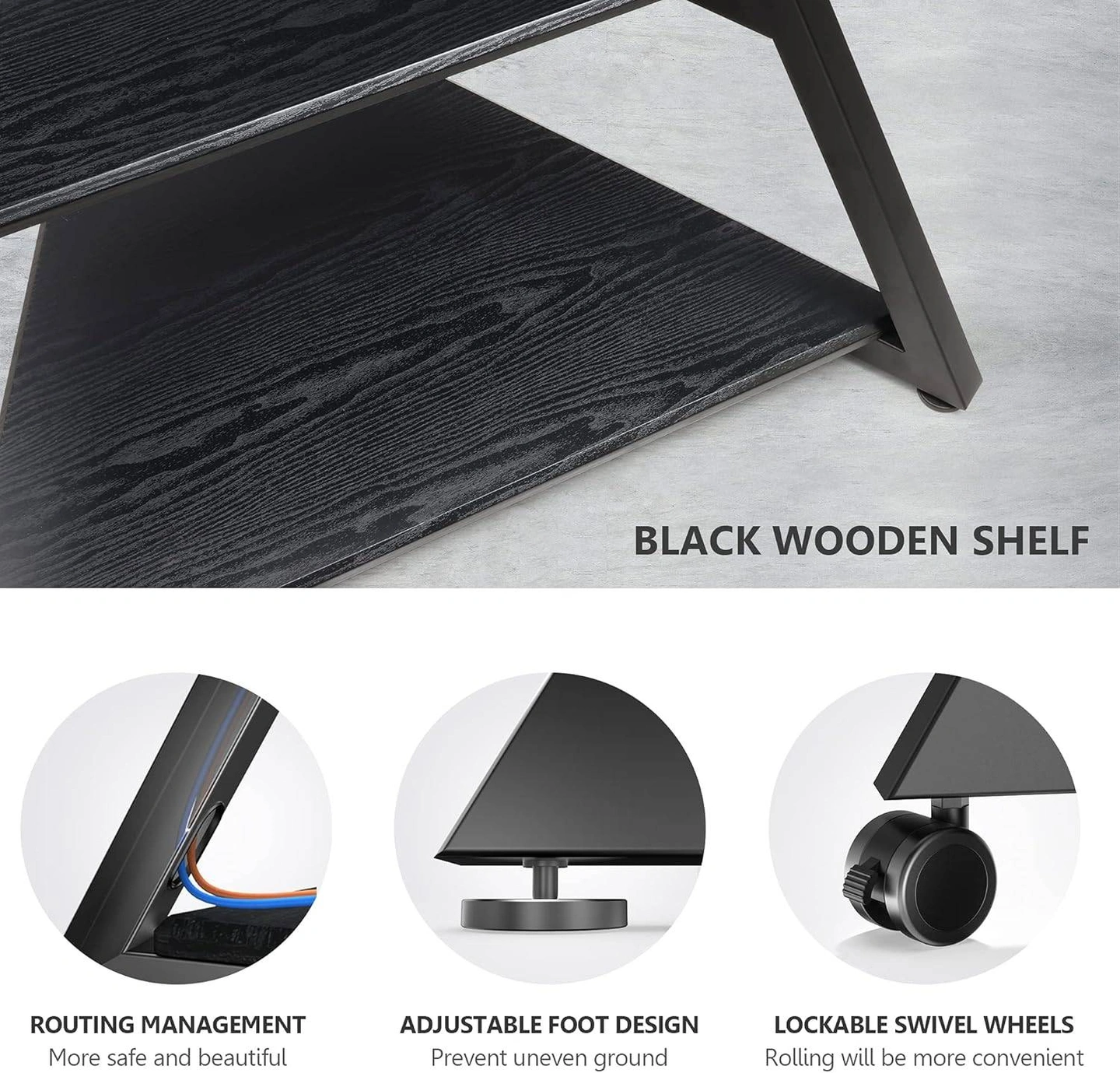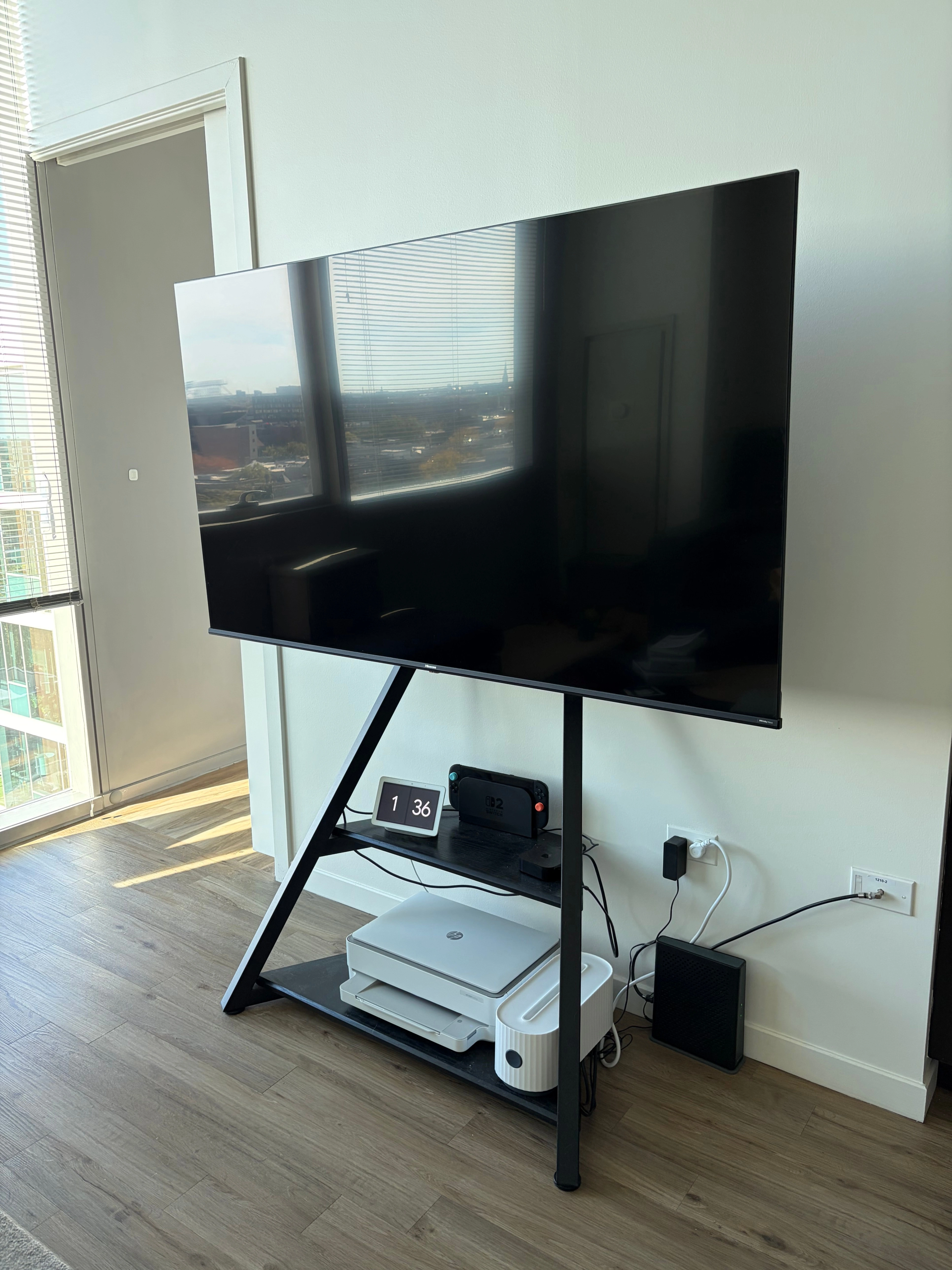 63FITUEYES Eiffel Series minimalist TV stand with wood shelves. Fits most 43–75 inch TVs (shown with a 65" TV). Clean, modern look with open shelving and built-in cable management holes to keep cords organized. Adjustable height with 15° swivel and −5° to +15° tilt for flexible viewing. Matte black frame with wood-look shelves. Currently shown without wheels in photos, but the original wheels are included — either attached before pickup or packed separately for convenience. Condition: Used gently and in excellent condition. All parts included and fully functional. Original Price: $200. Asking Price: $95 OBO Pickup: Local pickup in Lake View East / Wrigleyville. Easy to transport. Payment: Cash or Venmo