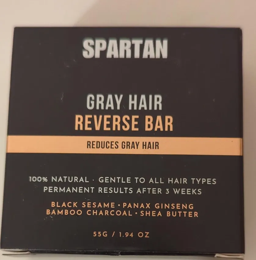 I'm selling a brand new Spartan Gray Hair Reverse Bar! It's designed to reduce gray hair and is made with 100% natural ingredients. It's gentle to all hair types and promises permanent results after 3 weeks. Key ingredients include black sesame, panax ginseng, bamboo charcoal, and shea butter. The bar weighs 55g / 1.94 oz