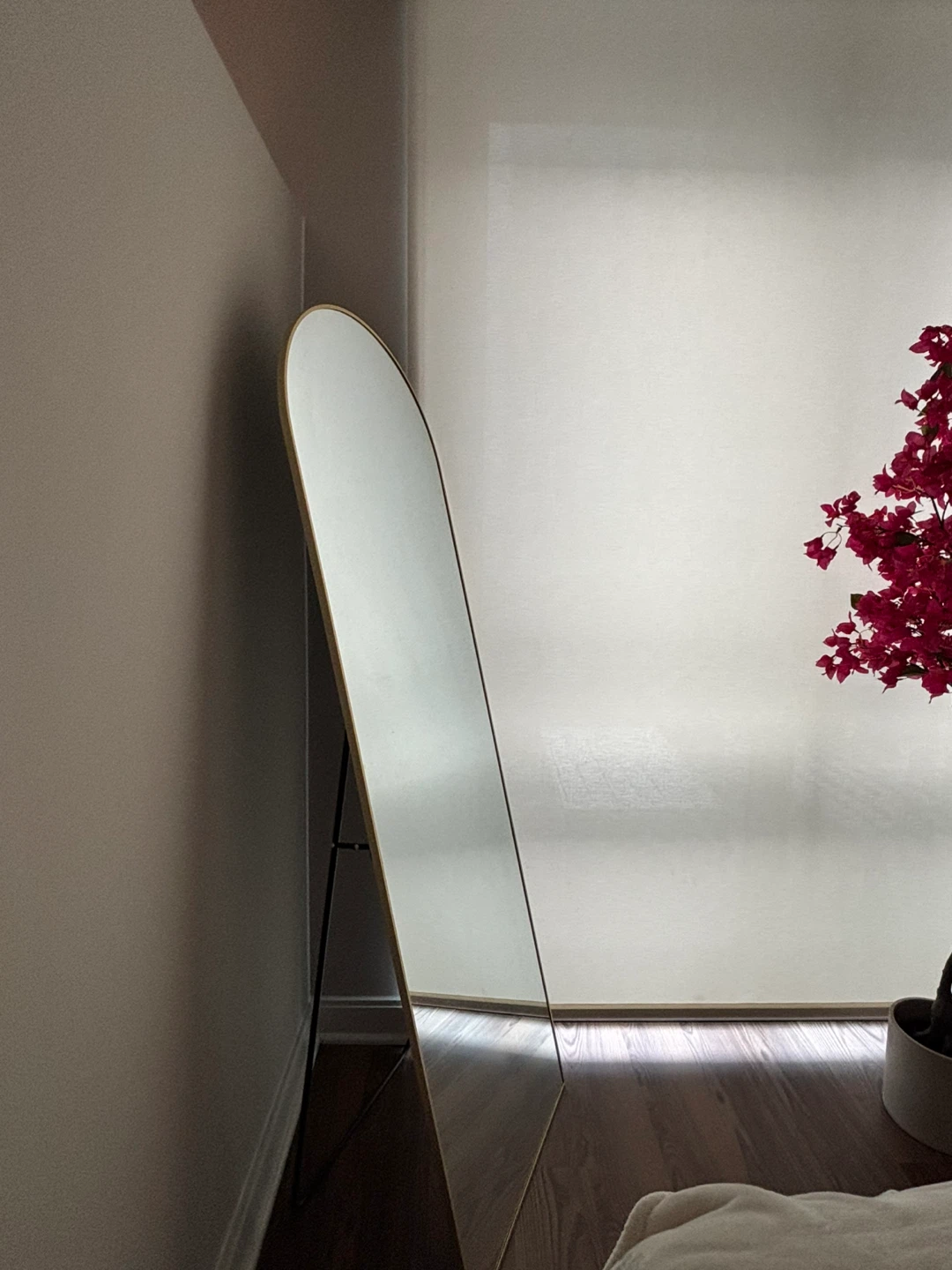 This freestanding full-length mirror features an arched top and a slim gold-tone metal frame. Its sleek design and large reflective surface make it a stylish addition to any room. Stand it against a wall or in a corner to add depth and light.