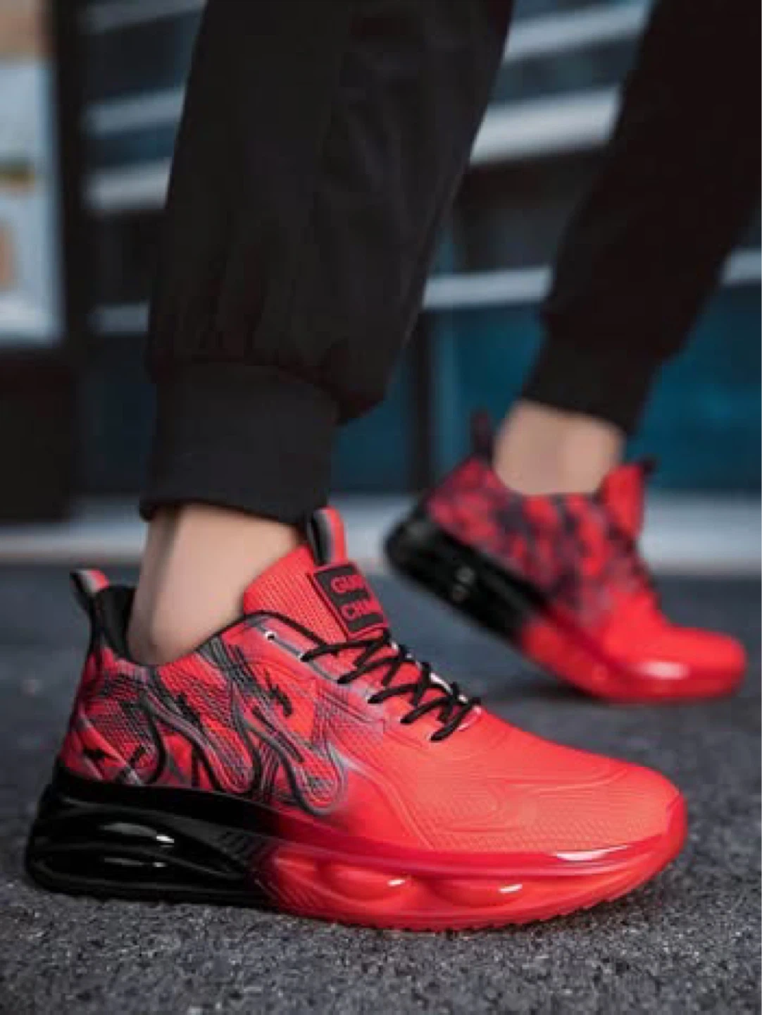 These red sneakers feature a cool black flame-like pattern. They have a bold red sole with a black heel detail. Laces are black.