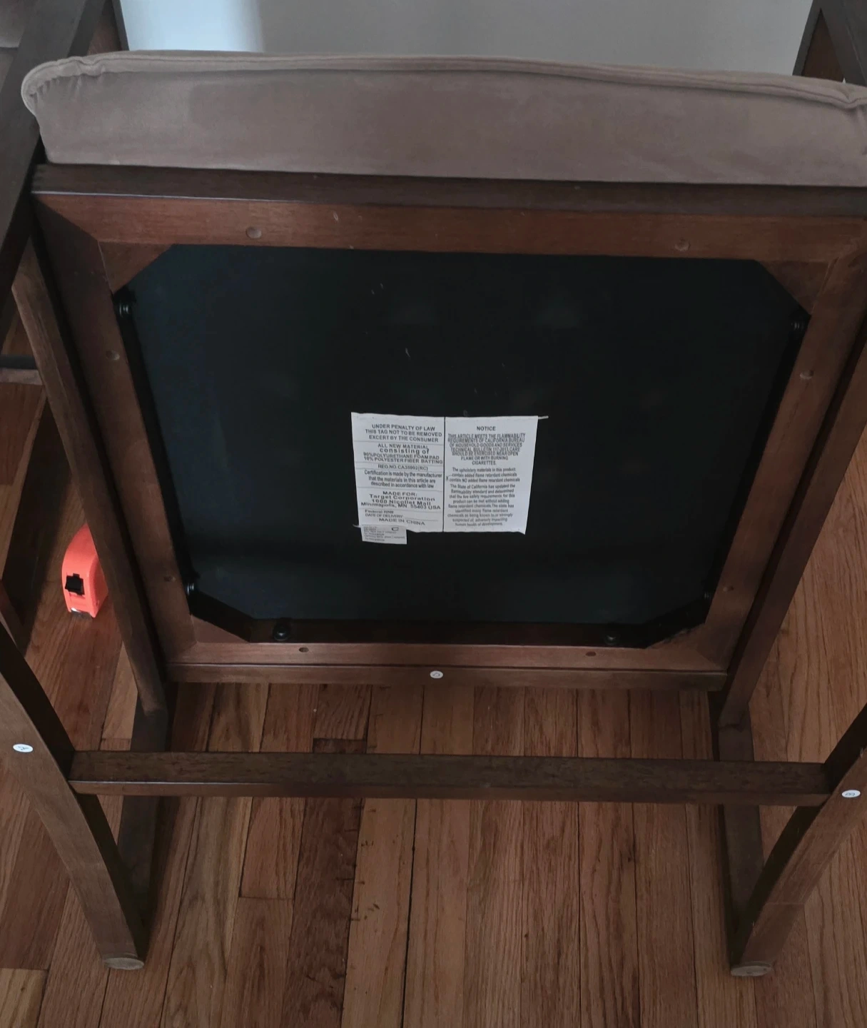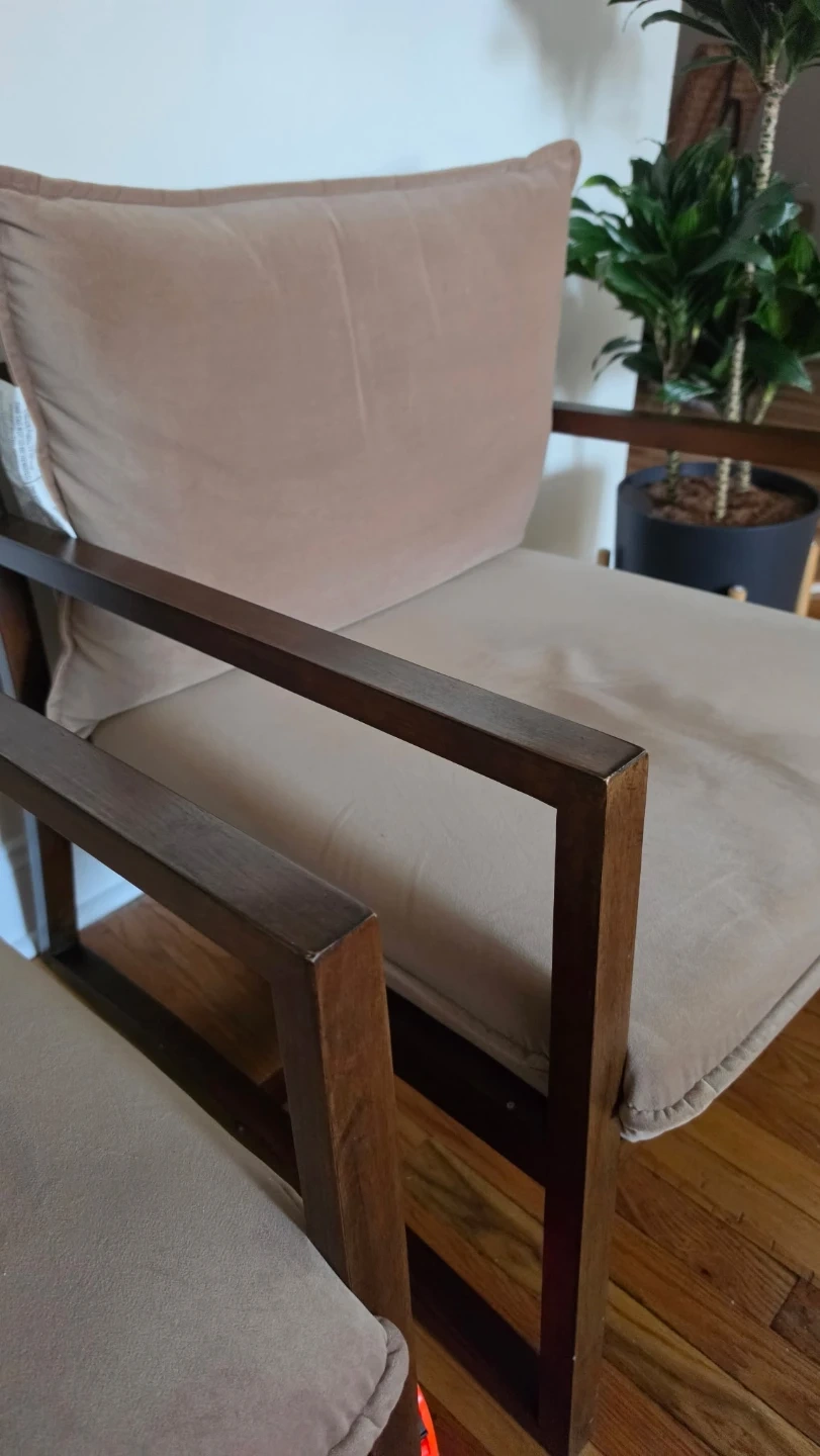 Stylish accent chair featuring a comfortable tan upholstered seat and backrest. Its dark wooden frame provides a modern, sturdy design. Perfect for adding a touch of comfort to any living space or bedroom!