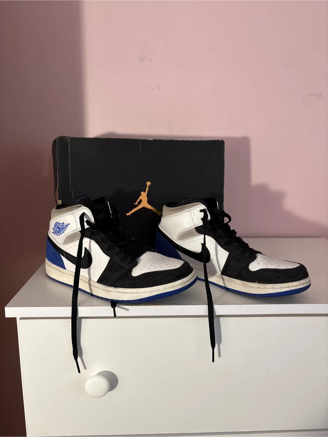 This is a pair of Air Jordan 1 Mid SE sneakers in a black, white, and royal blue colorway. The shoes include the original box. Leather and synthetic materials.