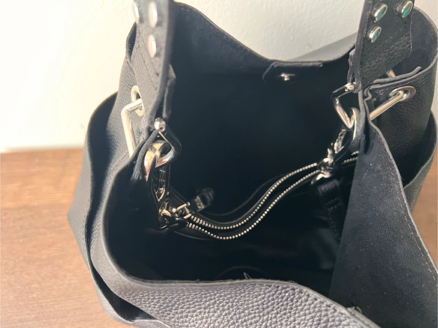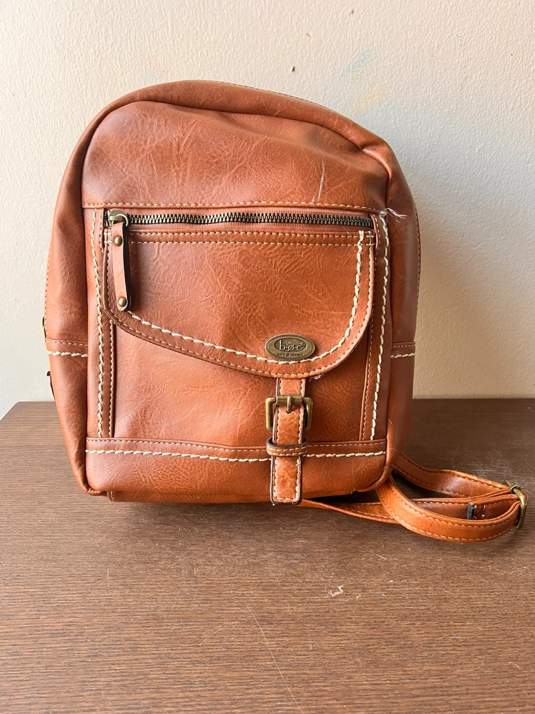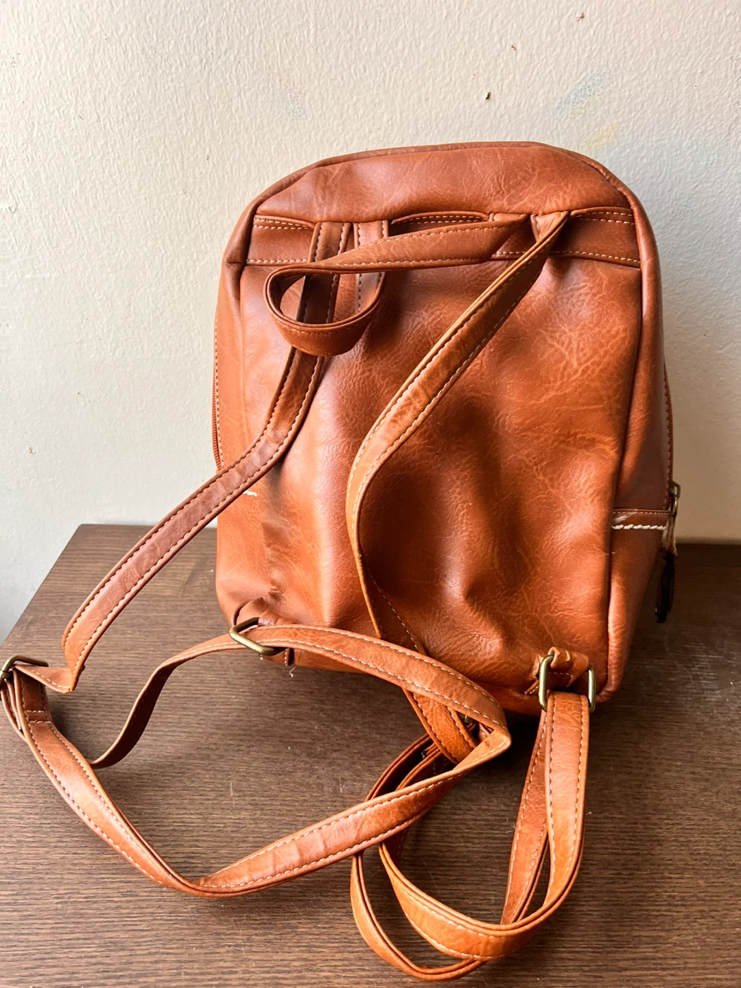 Cute brown faux leather backpack with white stitching details. It has a front flap pocket with a buckle closure and a zippered top compartment. Spacious interior with a few smaller pockets. Great for everyday use!