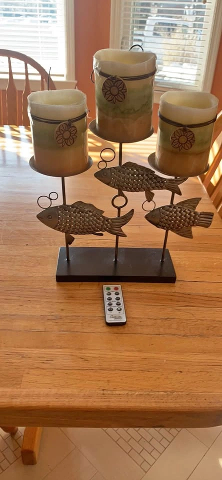 10Silver metal fish candle holder with black base. Three flameless decorative candles with remote control