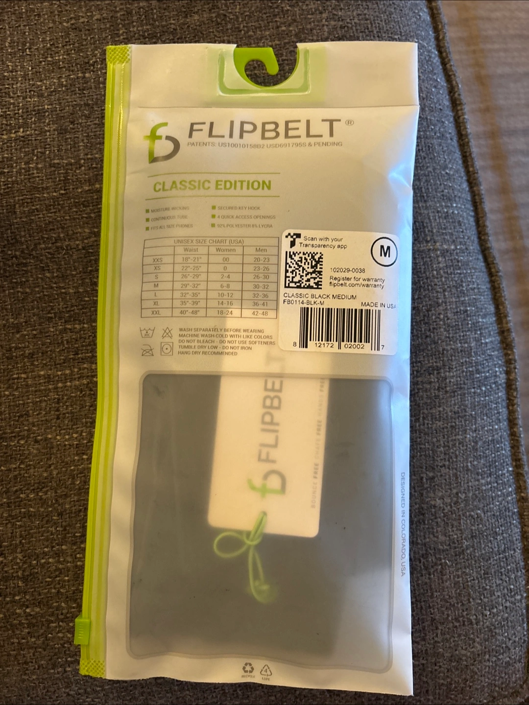 Never used I'm selling a FlipBelt Classic Edition in size M. It's great for running or any other activity where you need to carry your phone, keys, or other small items. It's made of 92% polyester and 8% lycra. It features moisture wicking, a secured key hook, and multiple openings. Fits all size phones