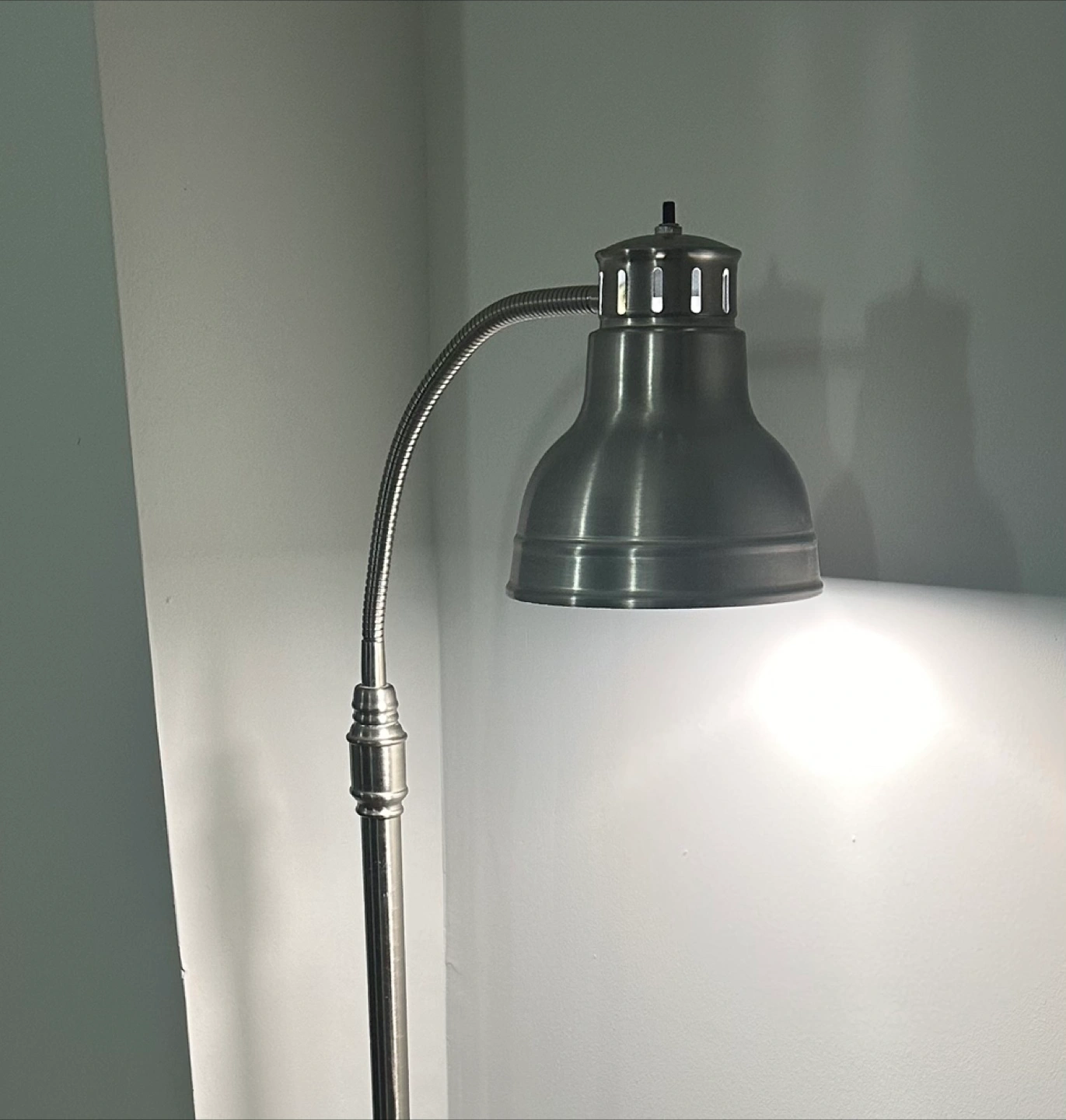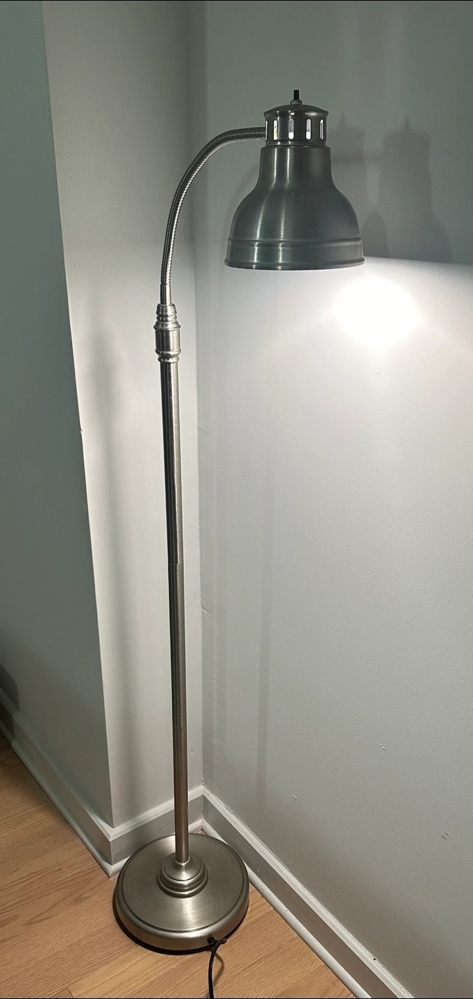 118Modern floor lamp. Brushed nickel finish. Flexible gooseneck design. Perfect for reading or task lighting.