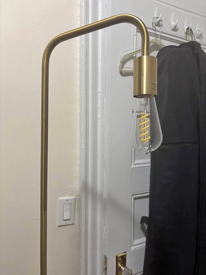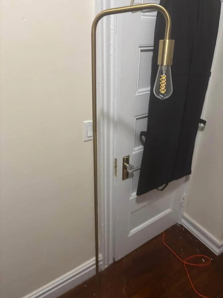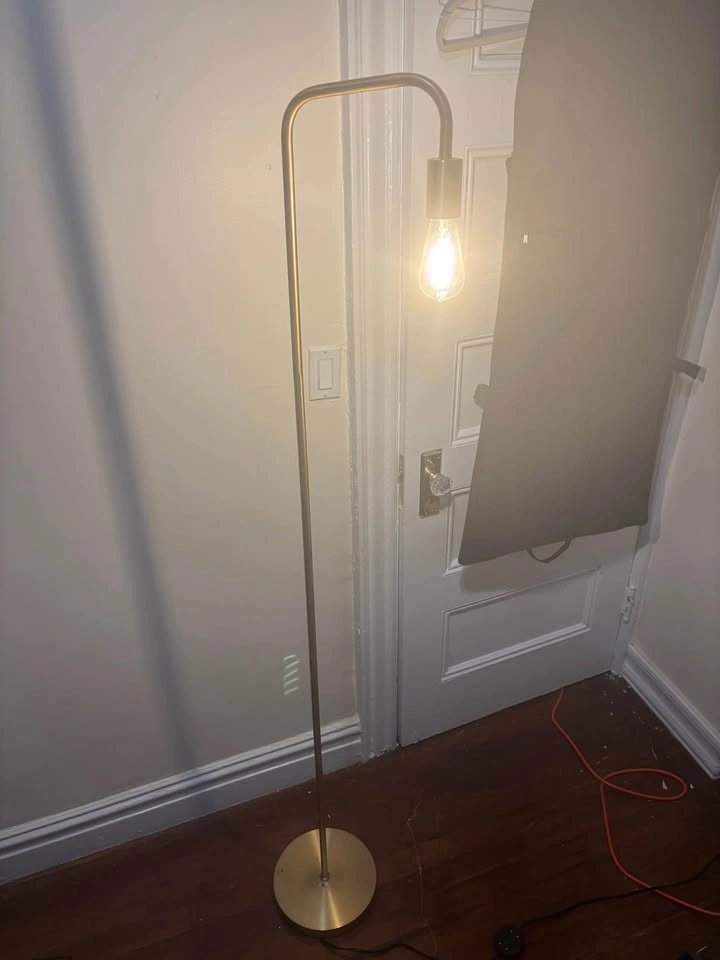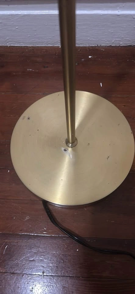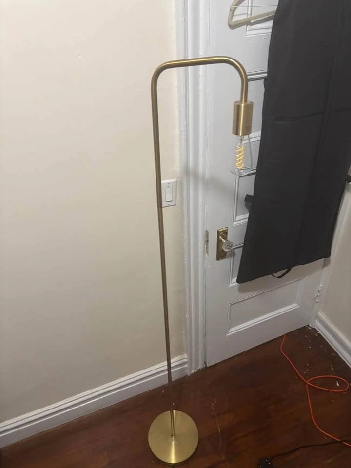 Minimalist modern gold lamp. Height 68”. Some defects on the base as shown on picture. Pickup in Hells kitchen.