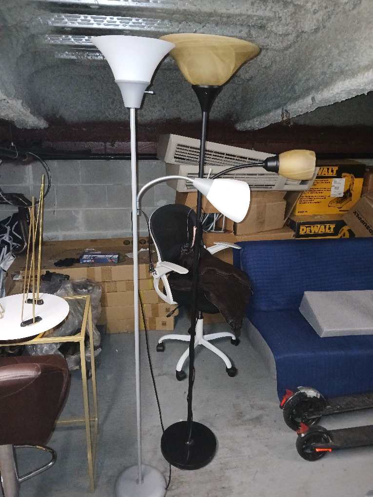 17Two Floor Lamps with White and Yellow Shades. One lamp has a flexible arm. Both lamps are in good working condition.