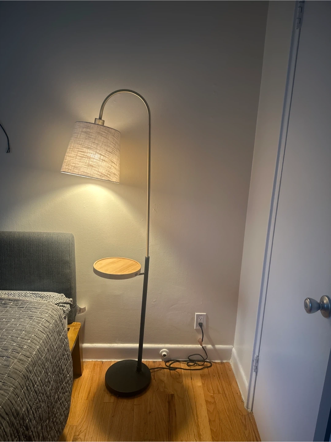 Selling a floor lamp that comes with a convenient attached side table. The side table includes a USB port for convenient charging. It has a linen shade and a sleek design that fits well in any room. The base is a sturdy black, and the pole is a stylish gold color. Perfect for adding both light and functionality to your space!