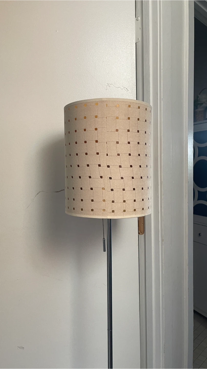 Selling a floor lamp with a beige patterned shade. It's in great condition and would look lovely in any room. The lamp has a sleek, simple design with a chrome finish. It provides a nice, warm light