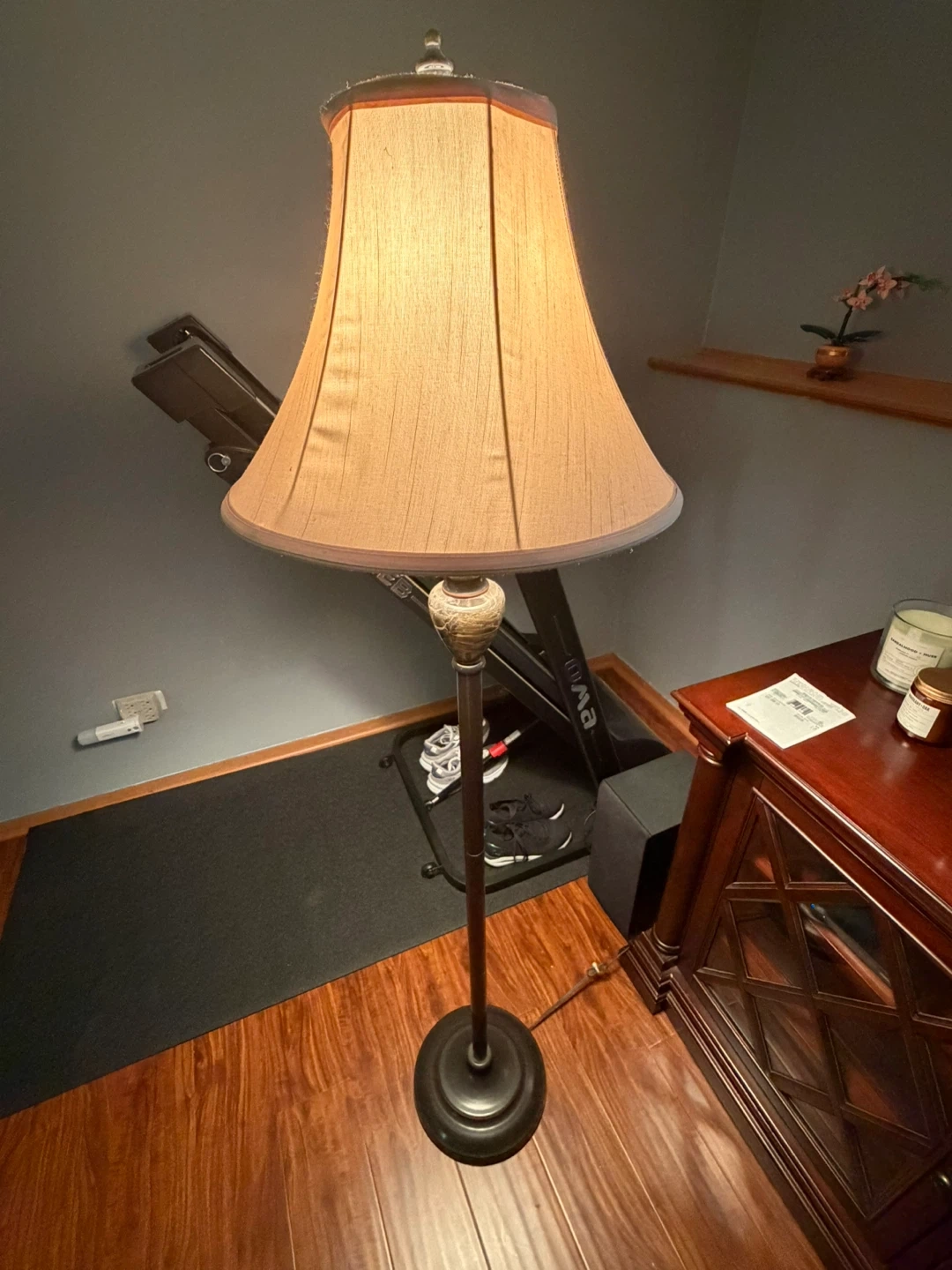 104Selling a floor lamp with a beige shade. It's in good condition and would look great in any room! The base is a dark color and has some decorative details