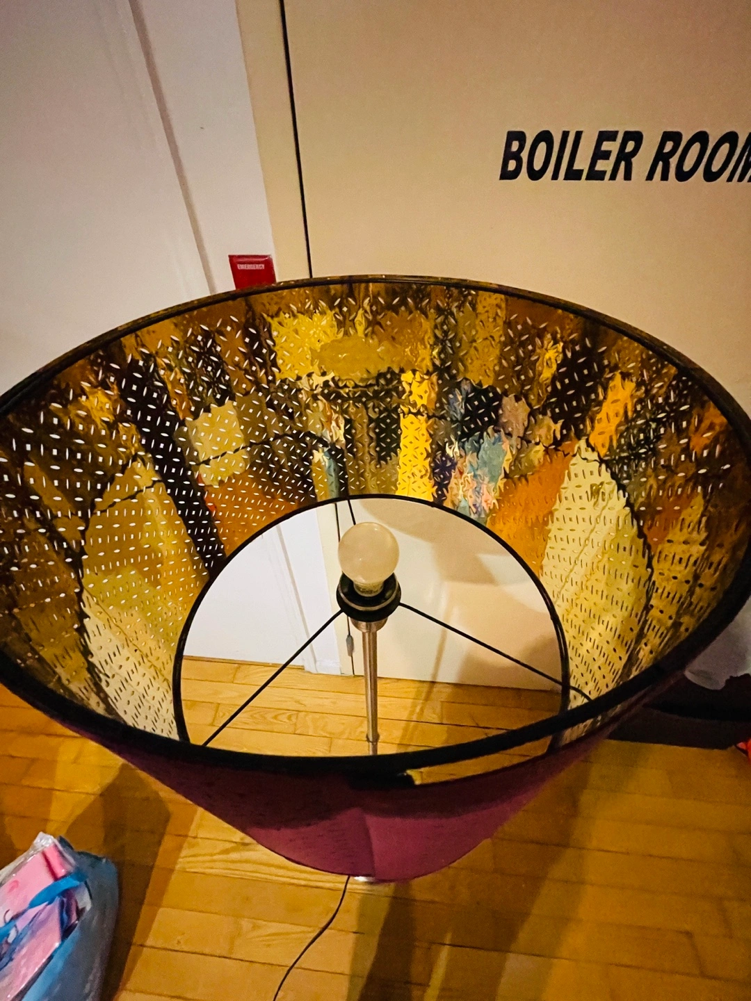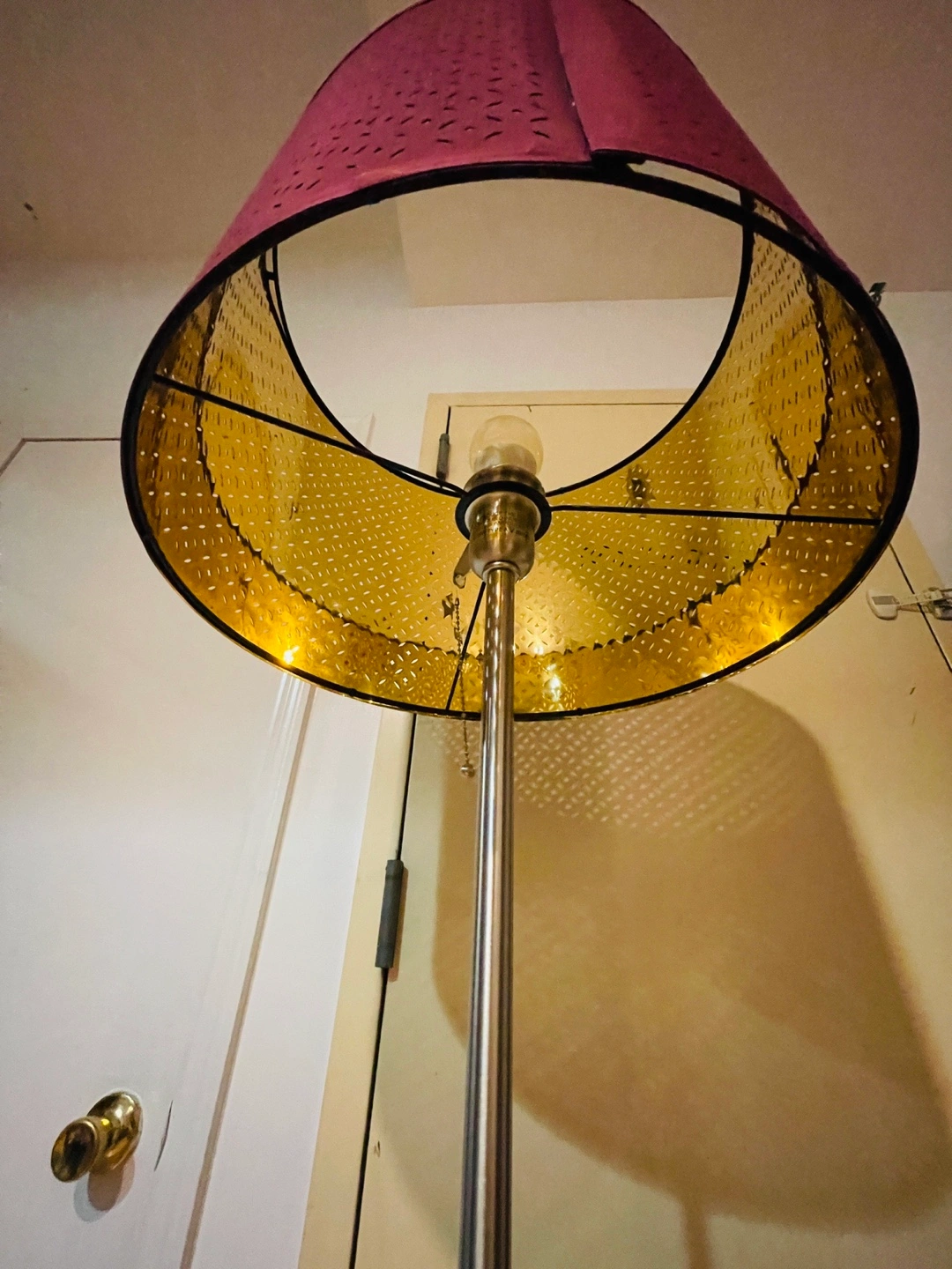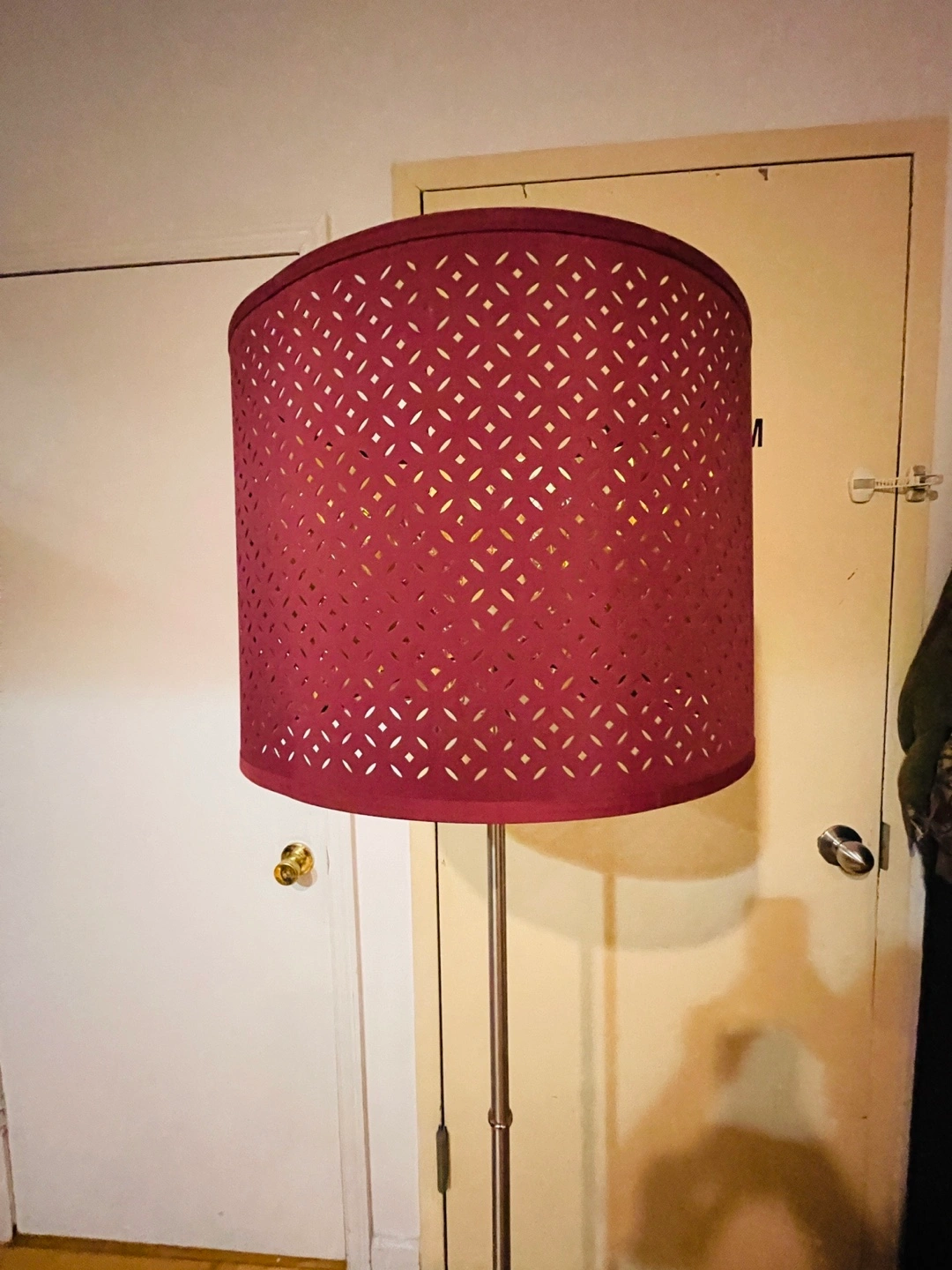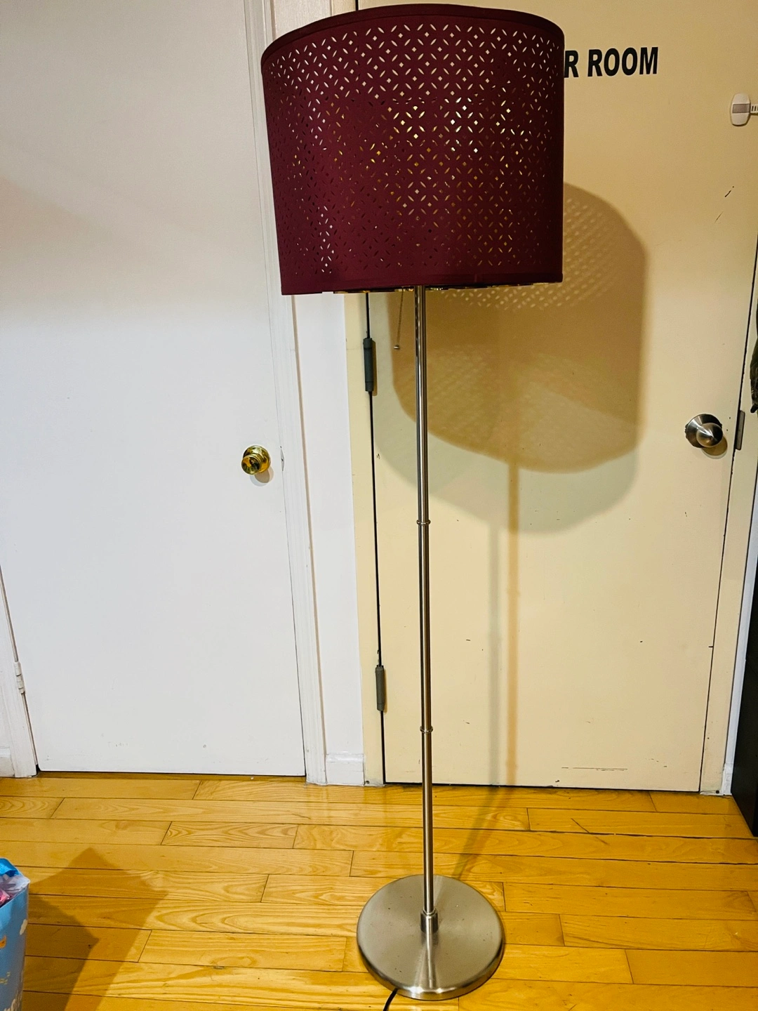 Tall floor lamp, silver metal base, burgundy fabric shade with cut-out pattern. Provides ambient light. Good condition. From ikea
