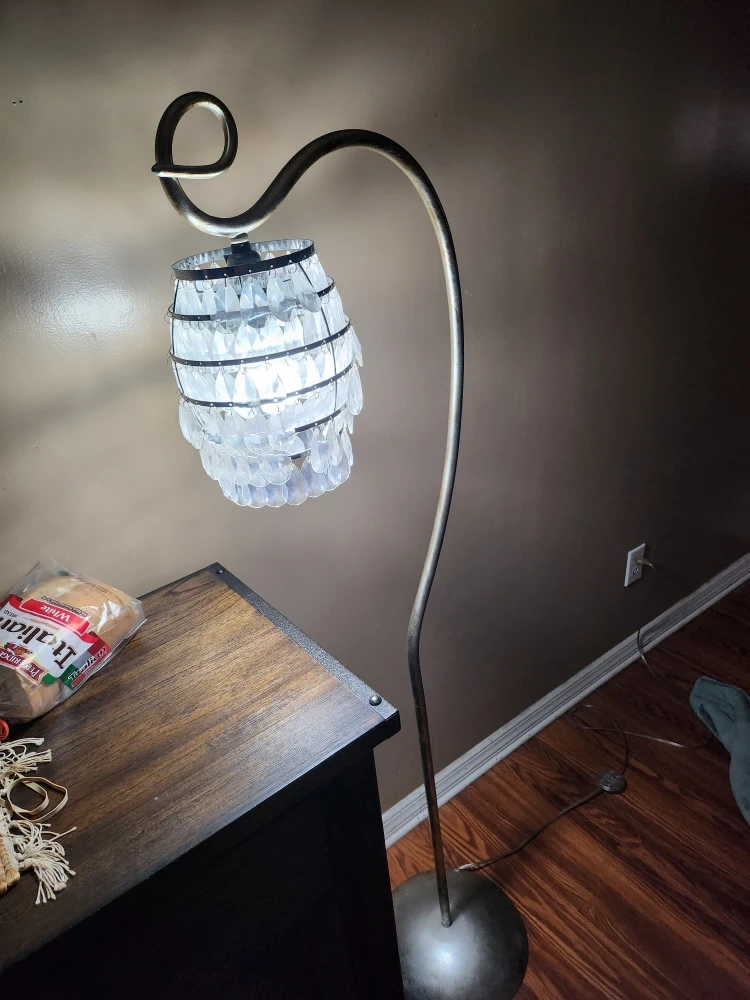 82Selling a floor lamp with a unique, decorative shade. It features a curved metal stand and a tiered shade made of translucent, iridescent discs. It would be great for adding a touch of elegance to any room