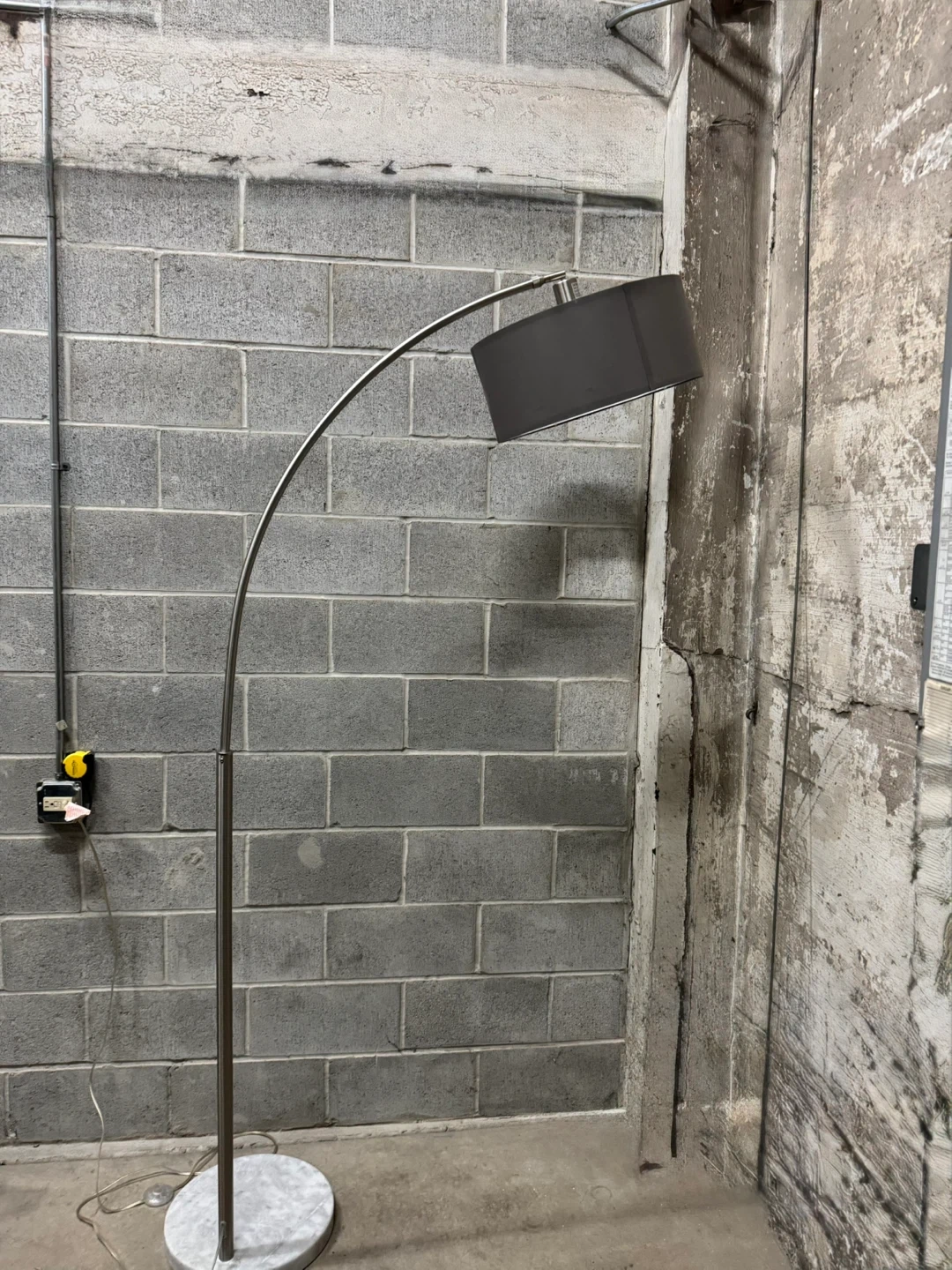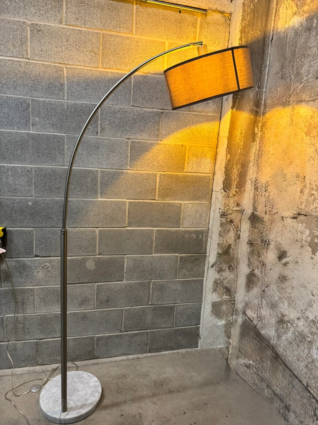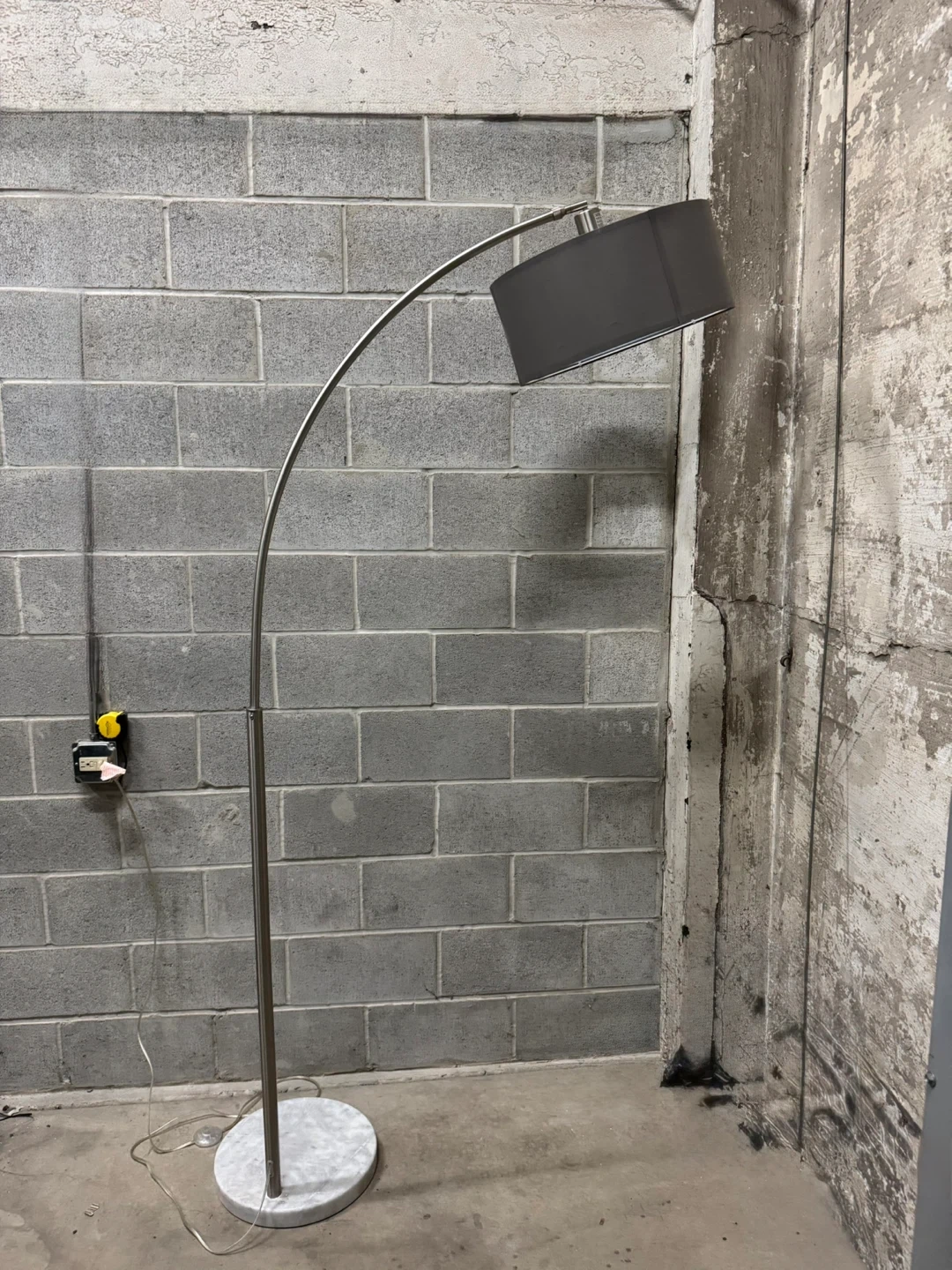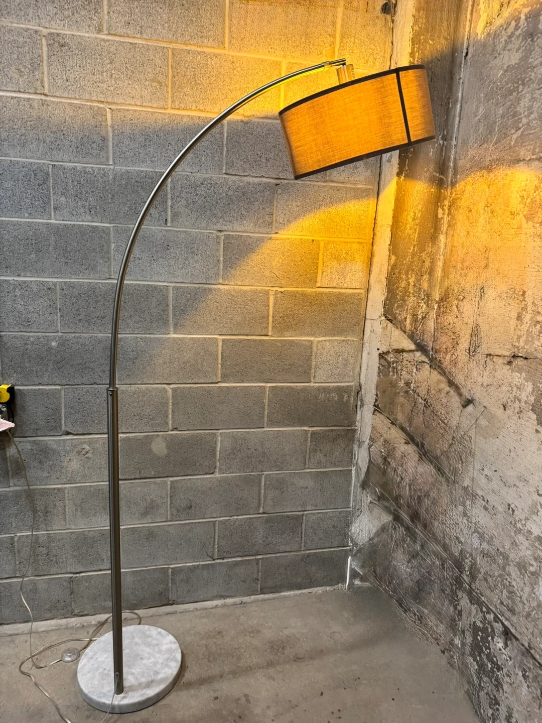 Selling an arc floor lamp with a marble base. It has a sleek, modern design that would look great in any living room or office space. The lamp is in good condition and provides ample lighting Floor Lamp with Marble Base and Grey Linen Lampshade Overhead Bedroom, Home Office Ligh 83 tall 60$ cash