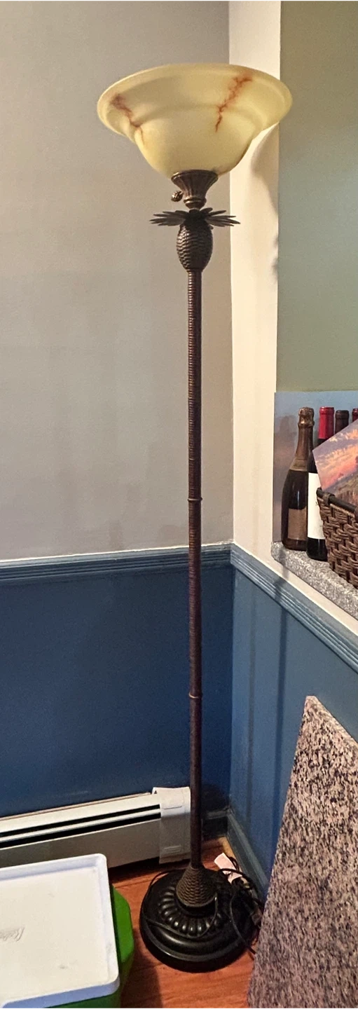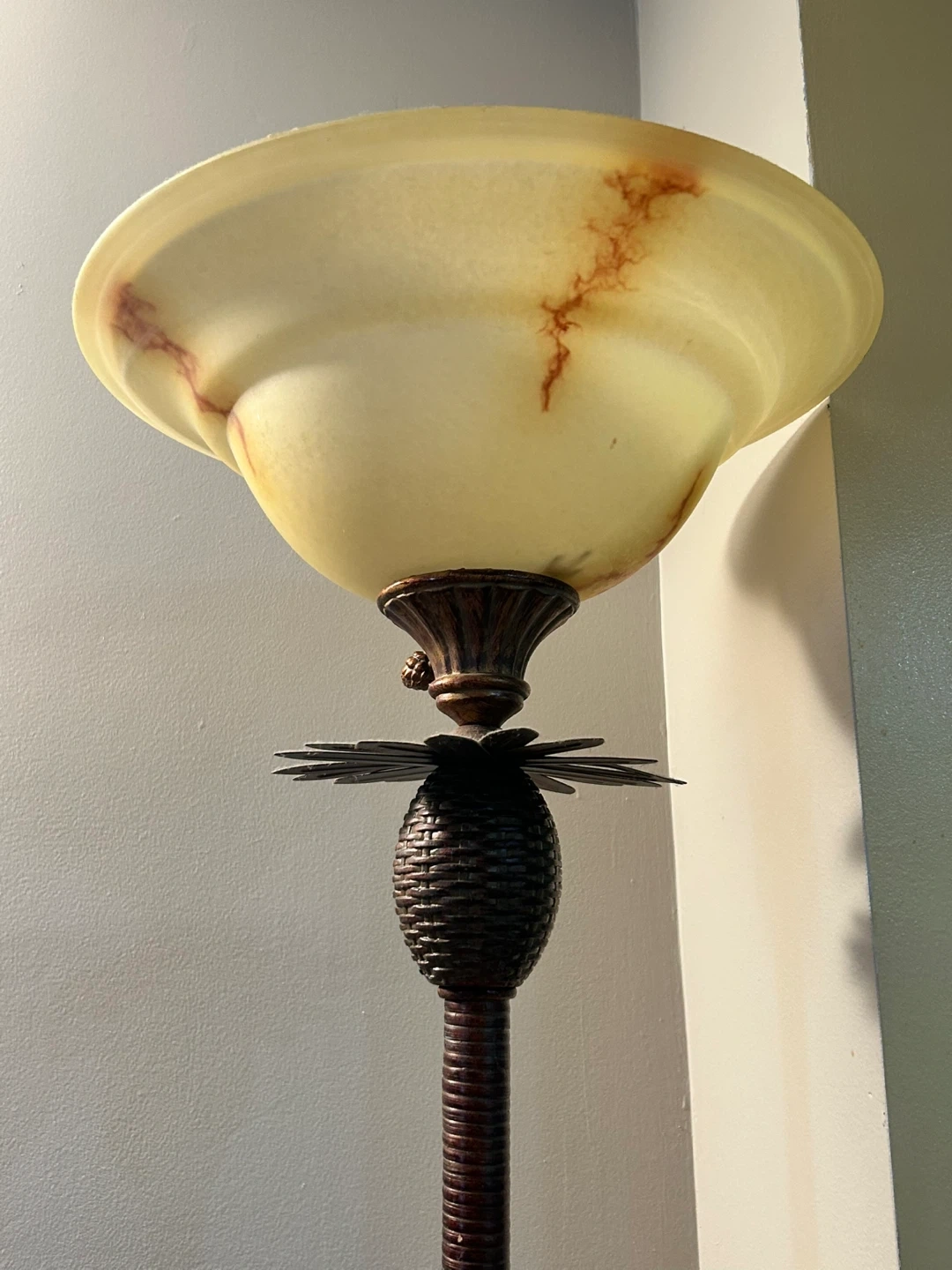 Here's a floor lamp with a beautiful marble-patterned shade! It has a dark brown, textured base and pole. It would look great in any living room or bedroom