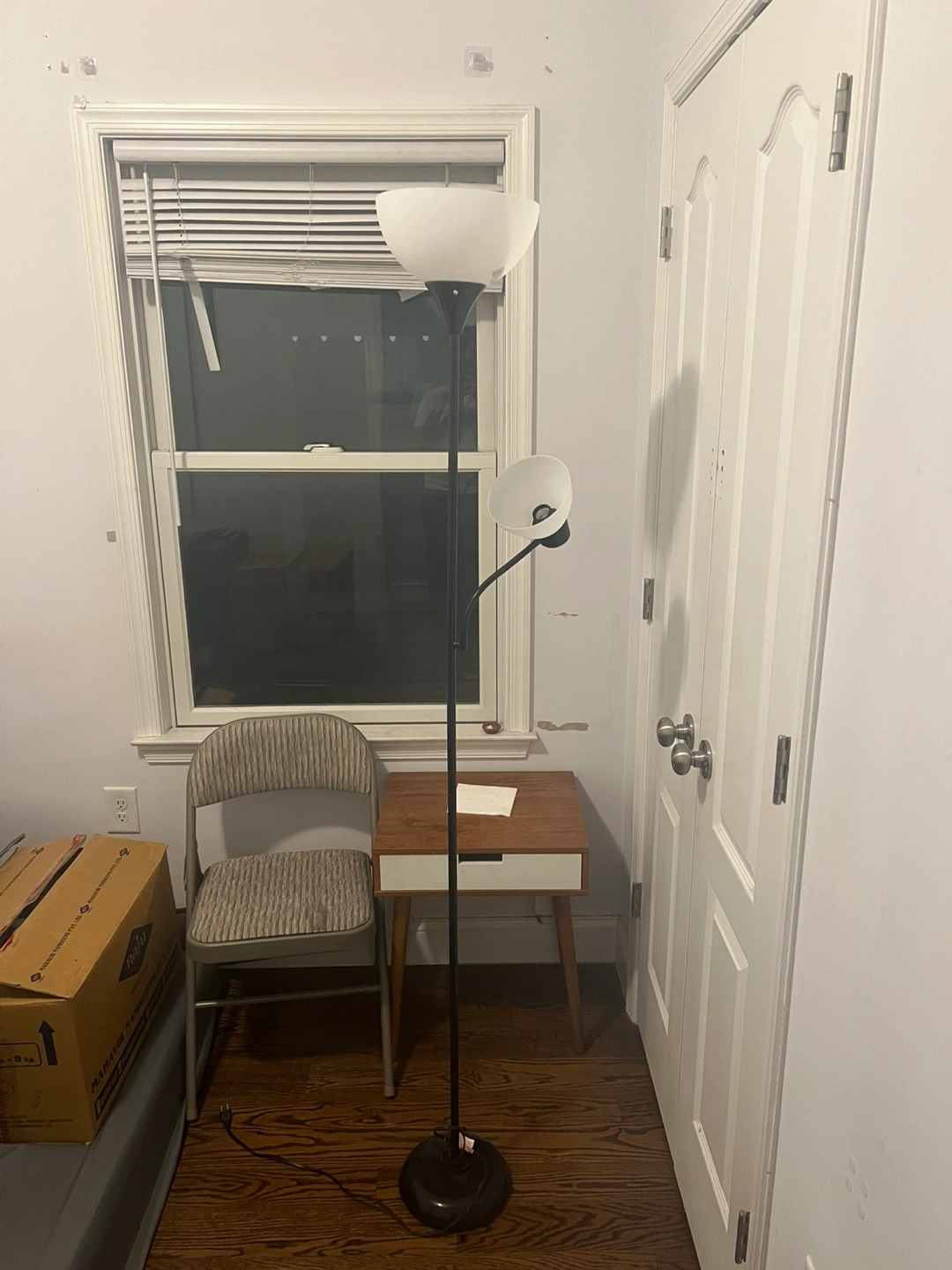 10Black floor lamp. Two lights. One large shade and one smaller reading light. Good condition.